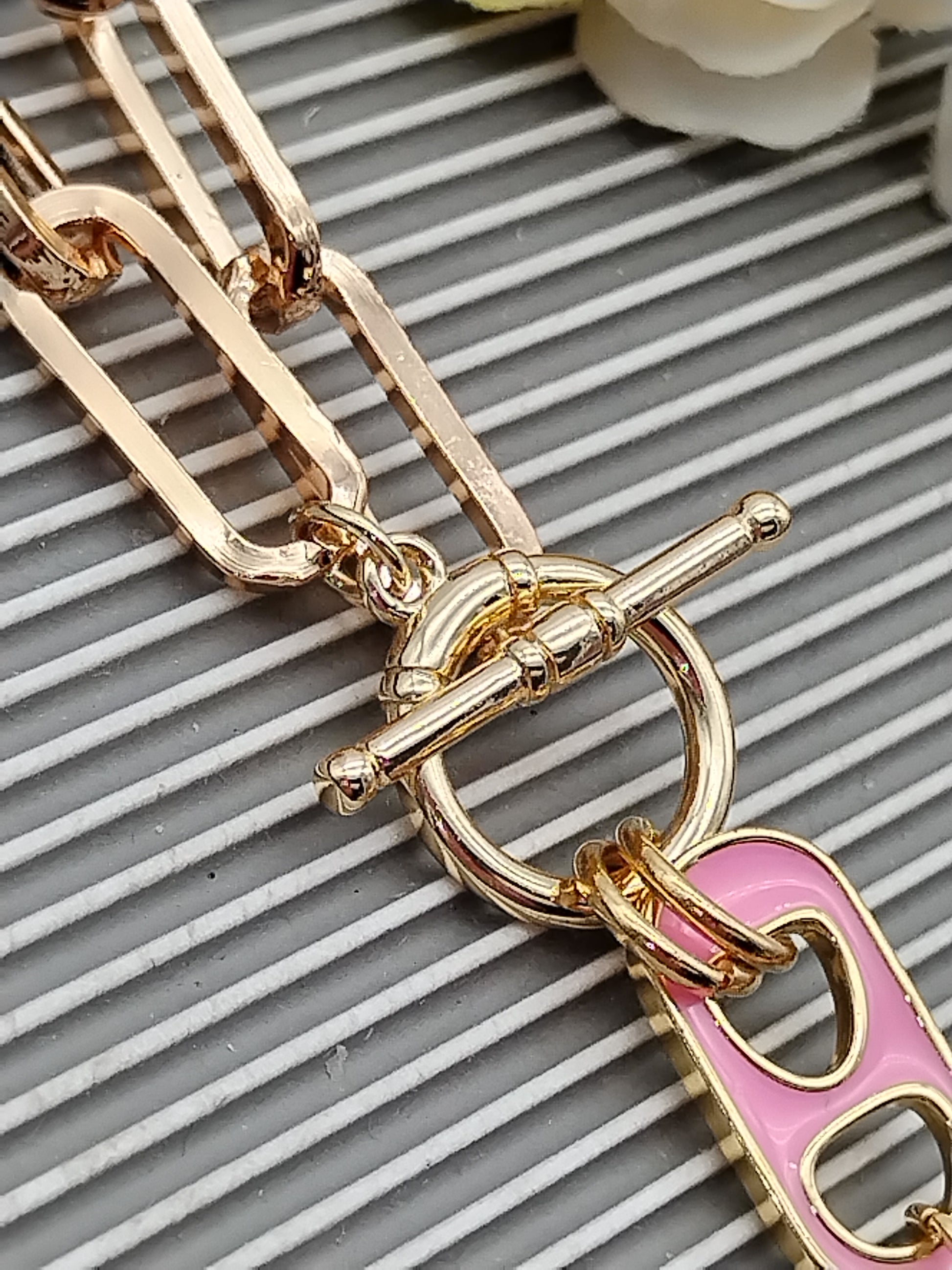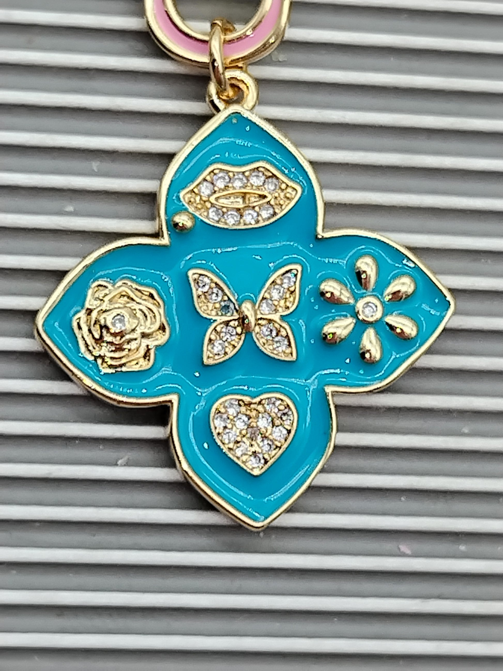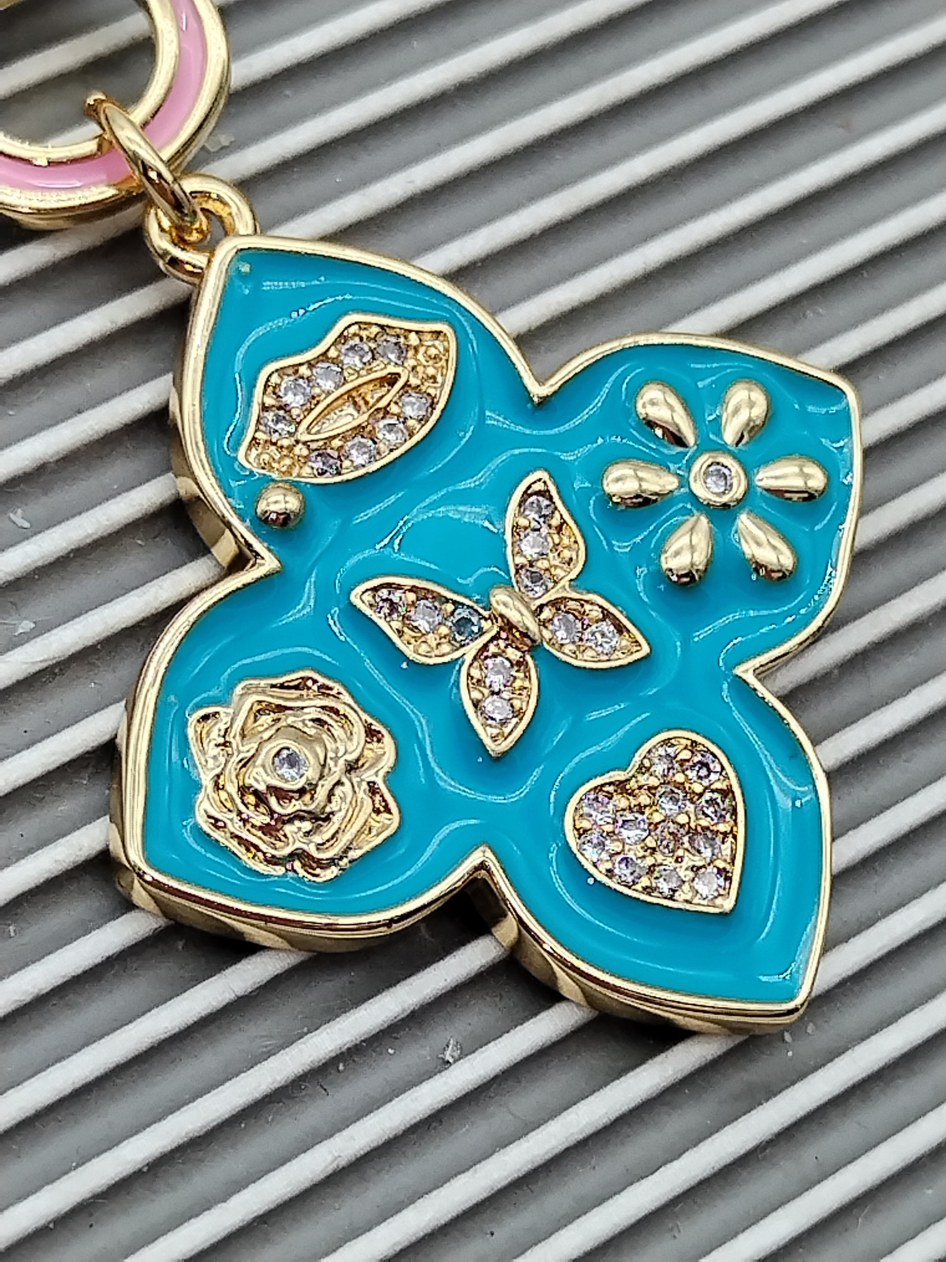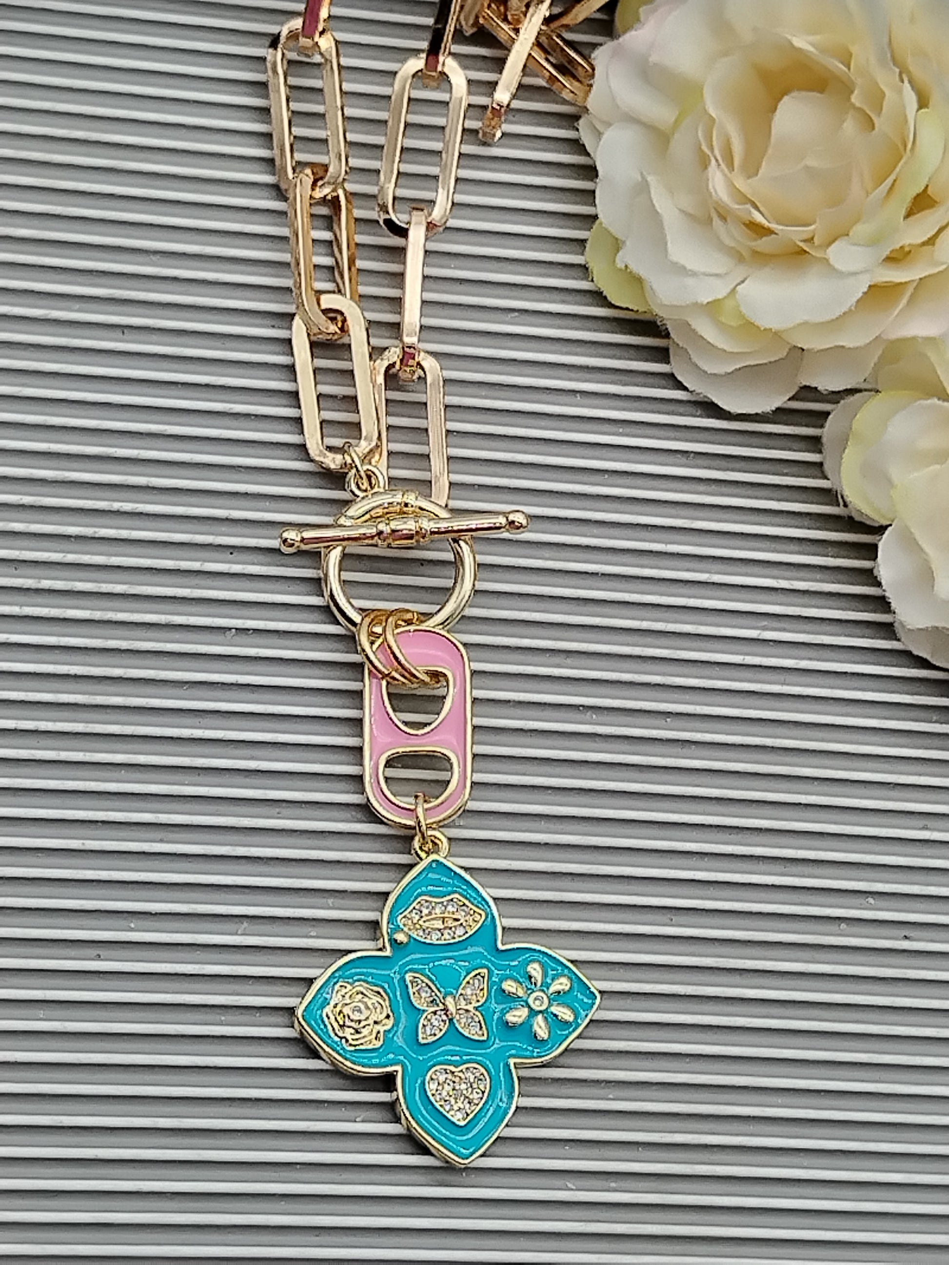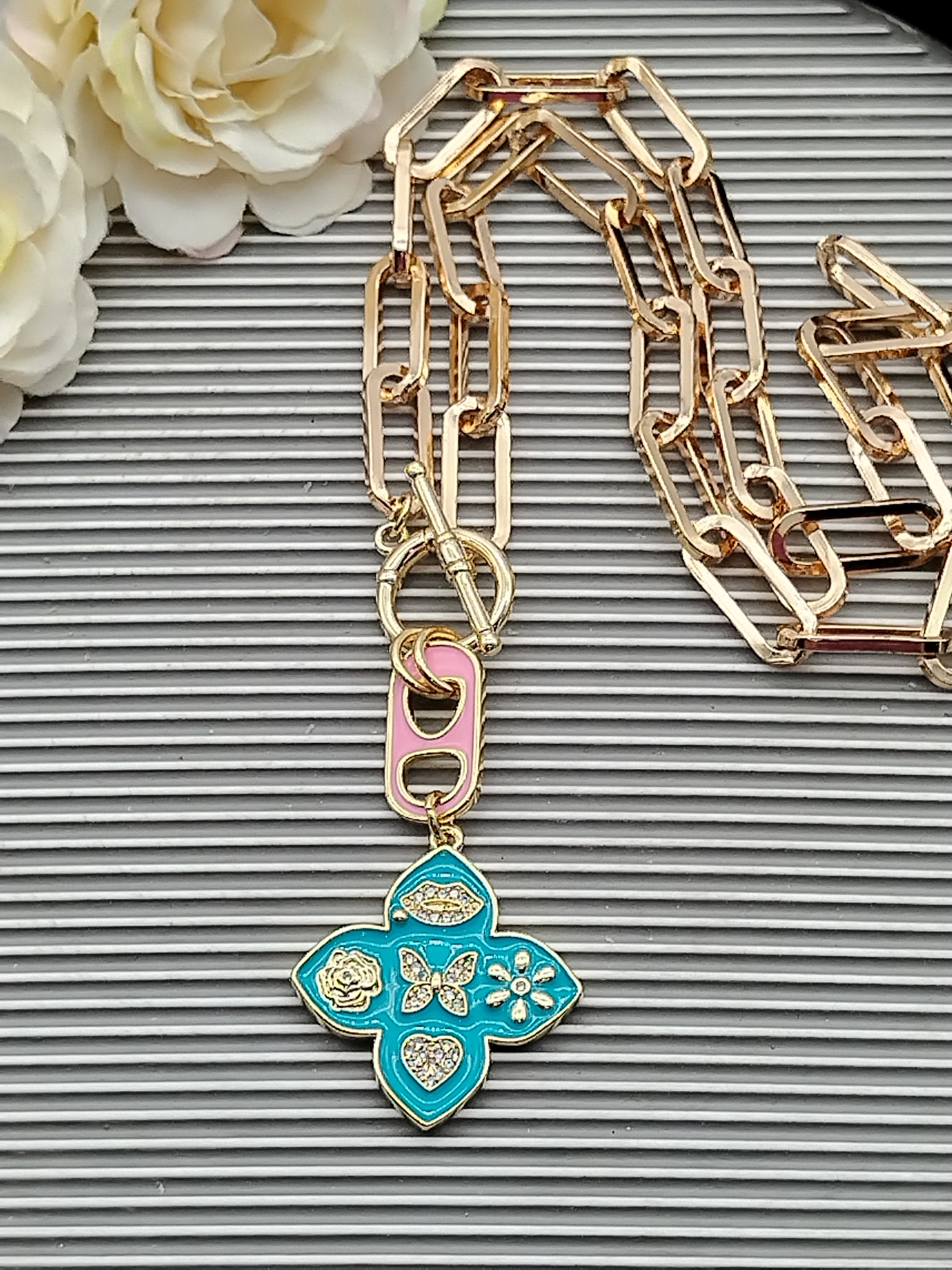 This lucky necklace features a unique turquoise clove charm (27mm ) with CZ pavé, made of 14k gold filled, on a large paper clip chain. The chunky, choker-style statement piece is finished with a toggle clasp for added security. Whether you're looking for the perfect lucky charm or a trend-setting piece of jewelry, this necklace is sure to make a statement. All 14k Gold filled