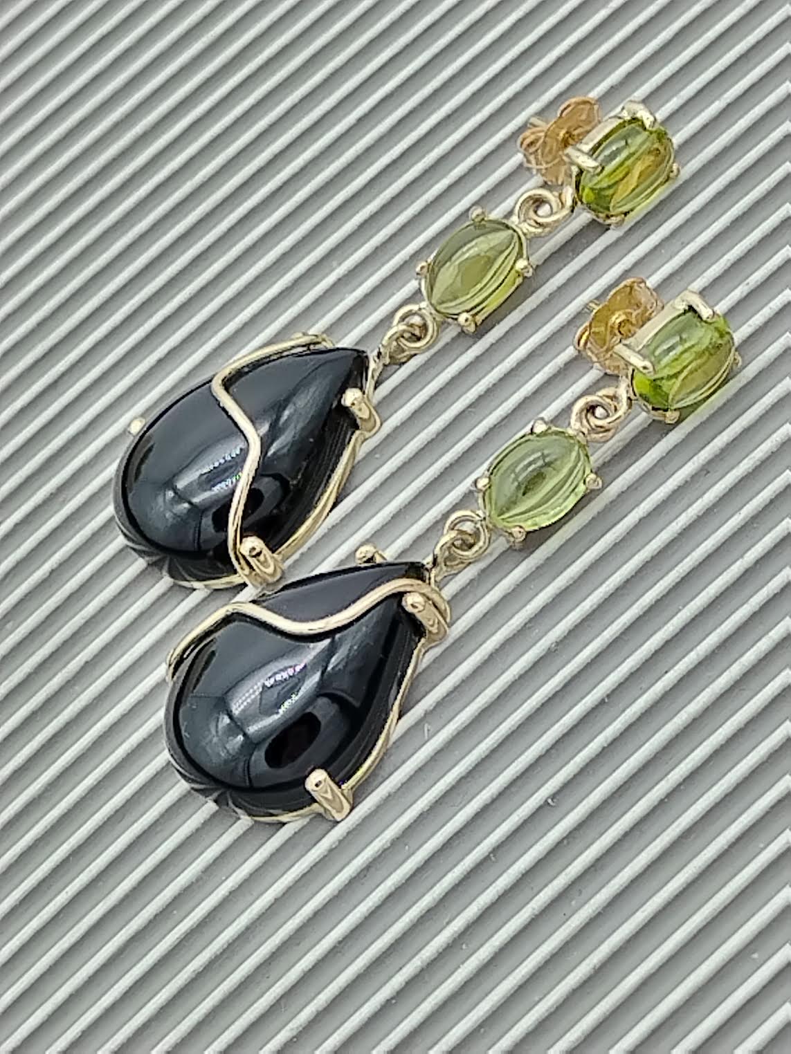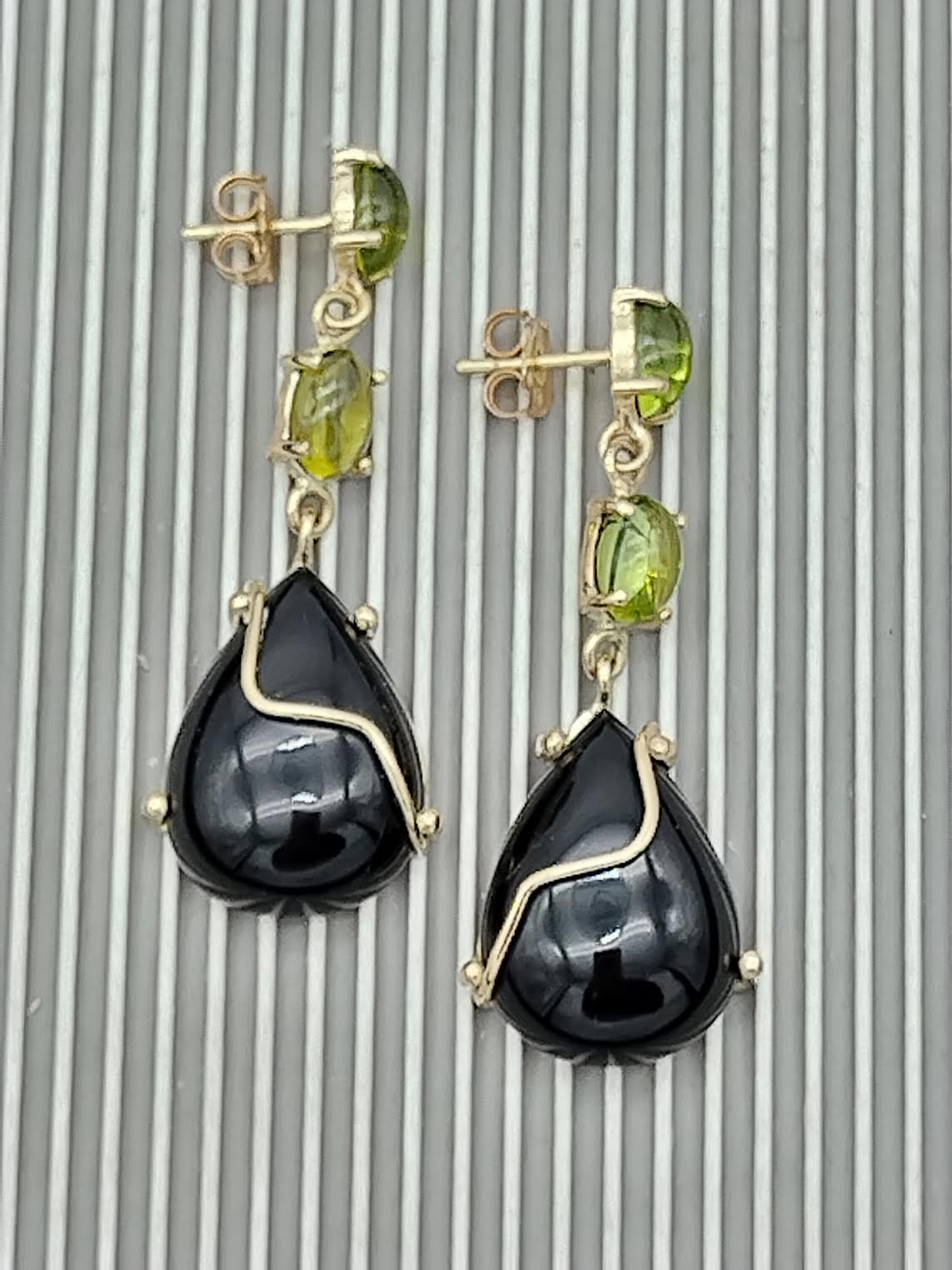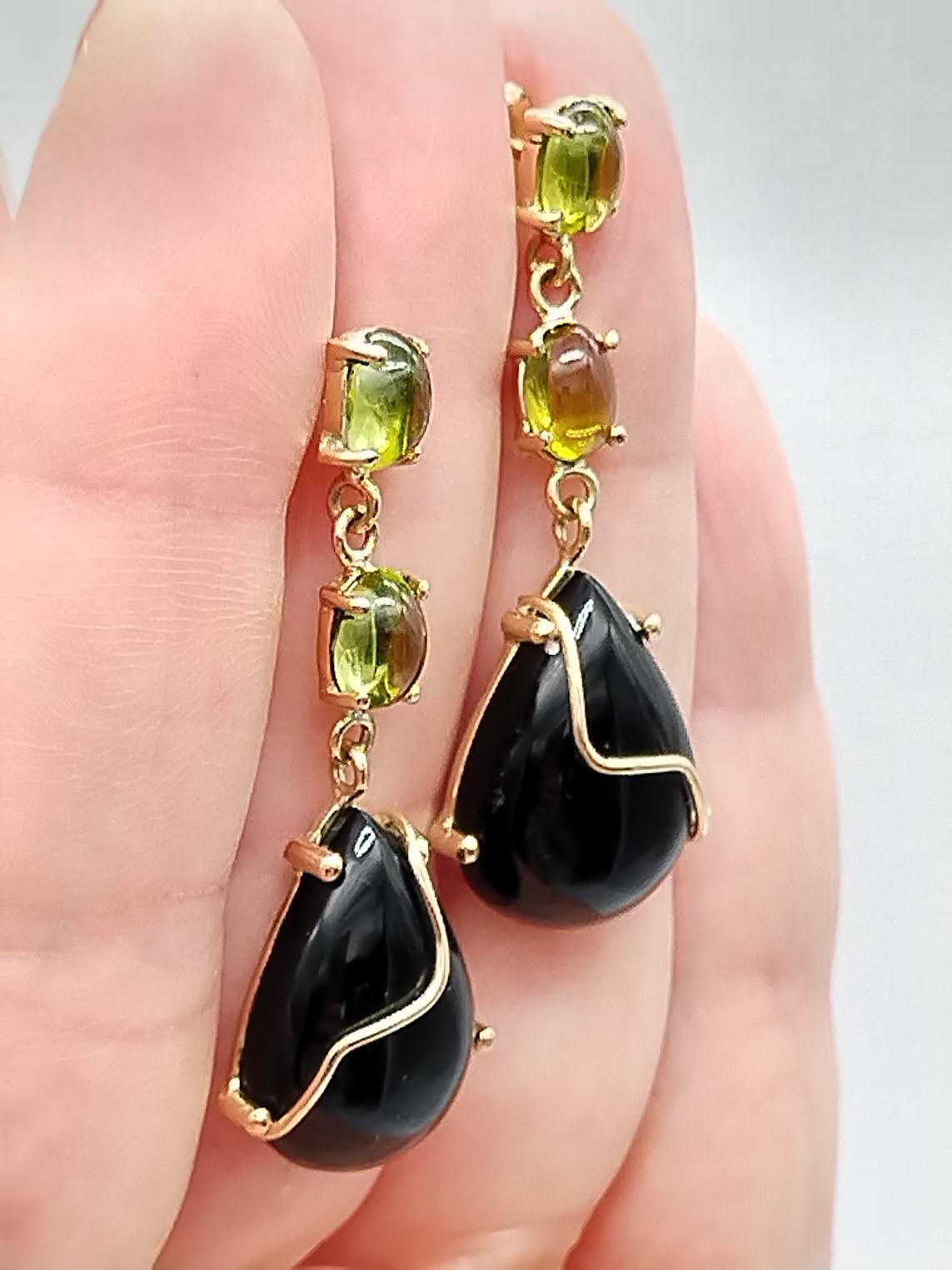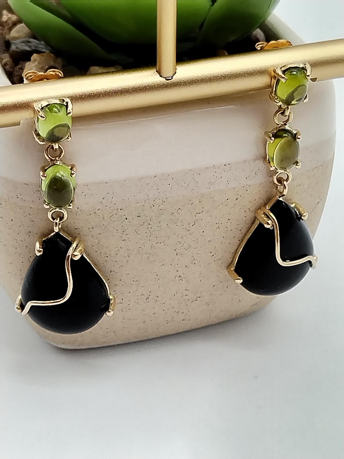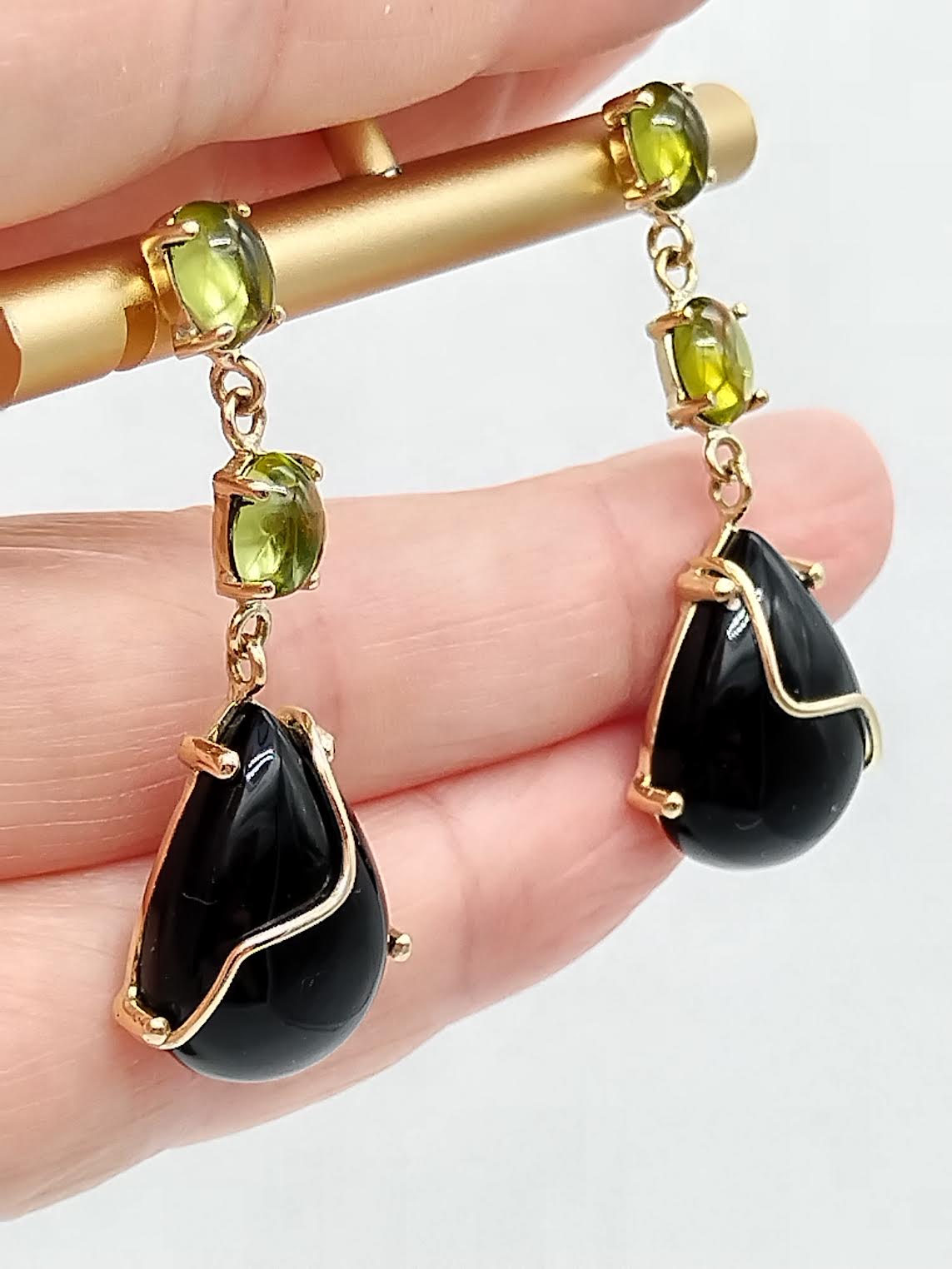 Peridot and Onyx Teardrop Dangle Earrings onto 14k Solid Gold. Gorgeous AAAA+ Brazilian Natural Oval Cabochon Peridots (8 x 5mm ), they're completely clean with a beautiful green color, therefore High Quality. Hanging at the end a large ( 20 x 14mm ) smooth gorgeous Black teardrop Onyx with a beautiful 14k Solid Gold wave crossing along them. Al gemstones have been setting with 4 prongs each and the whole earrings are handmade onto 14k Solid Gold. Stud earrings with a butterfly push back.