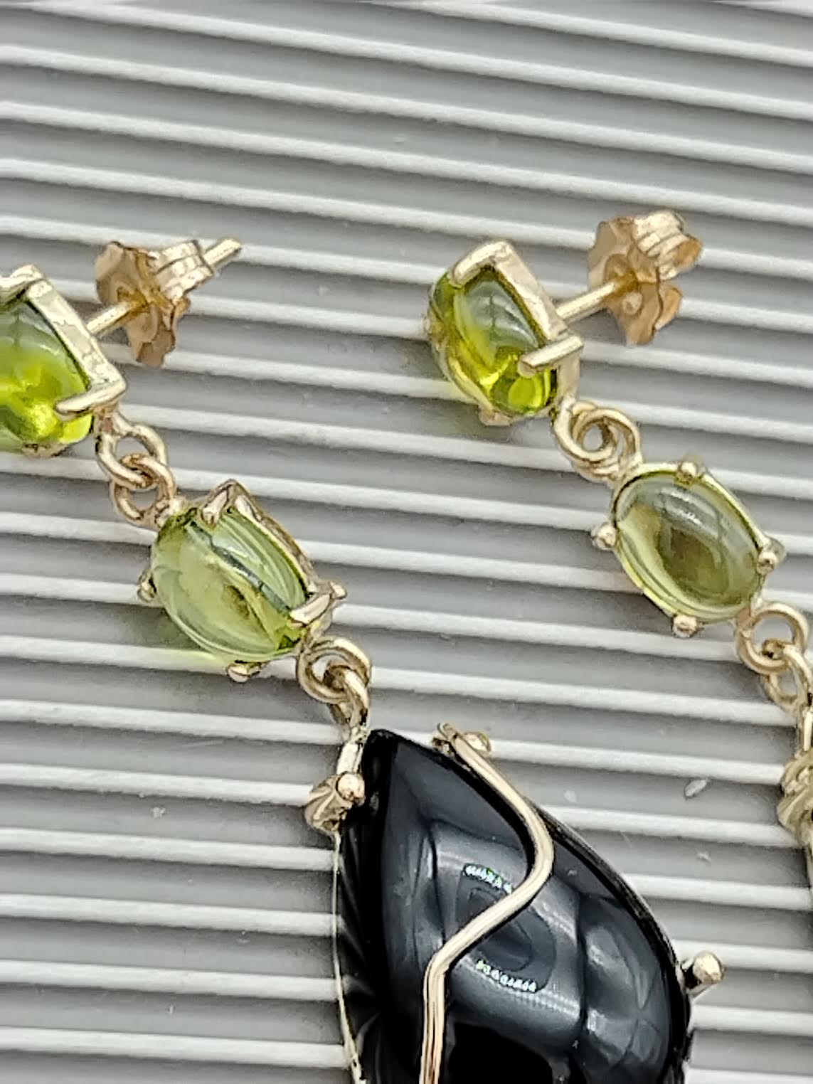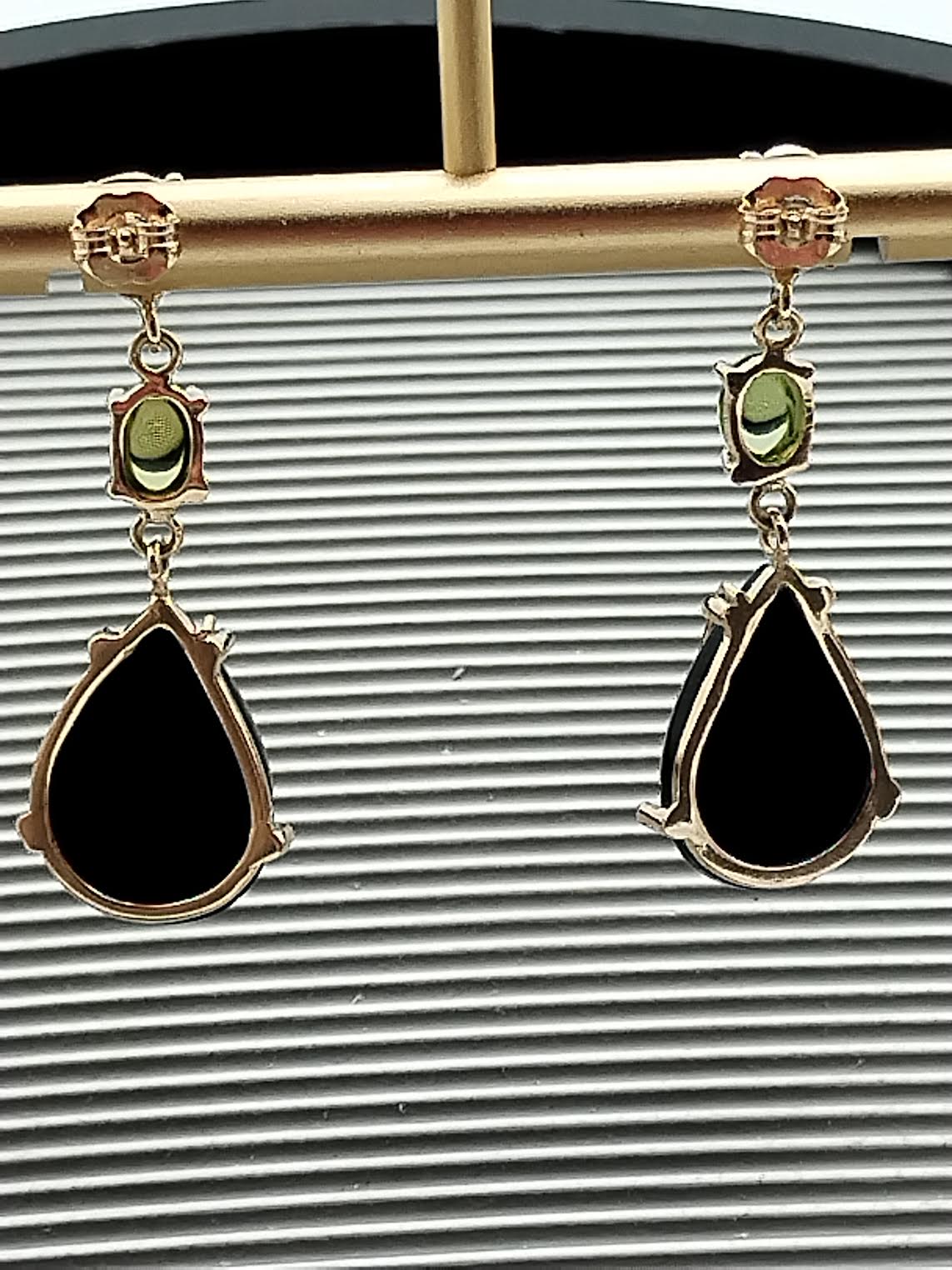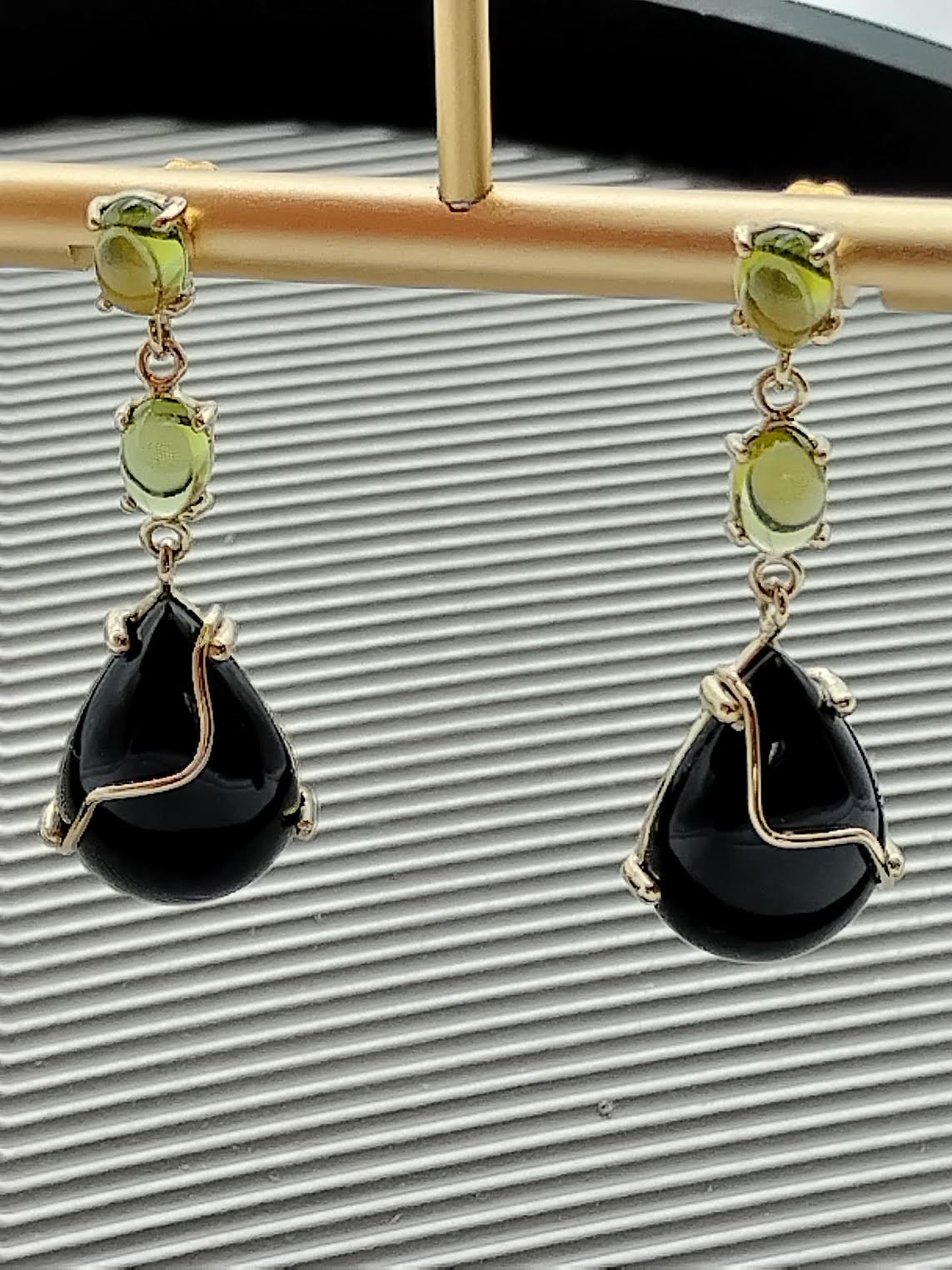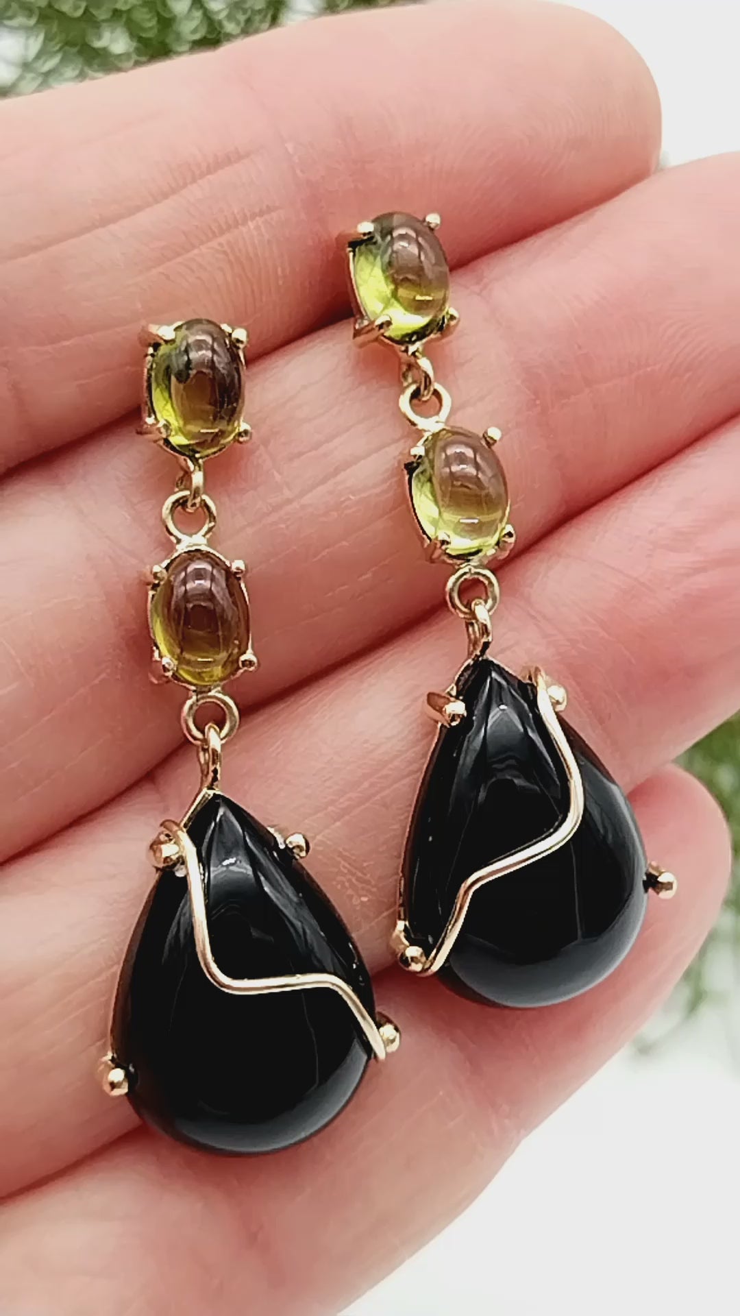 Peridot Drop Dangle Earrings,14k Solid Gold Earrings, Onyx Teardrop Earrings