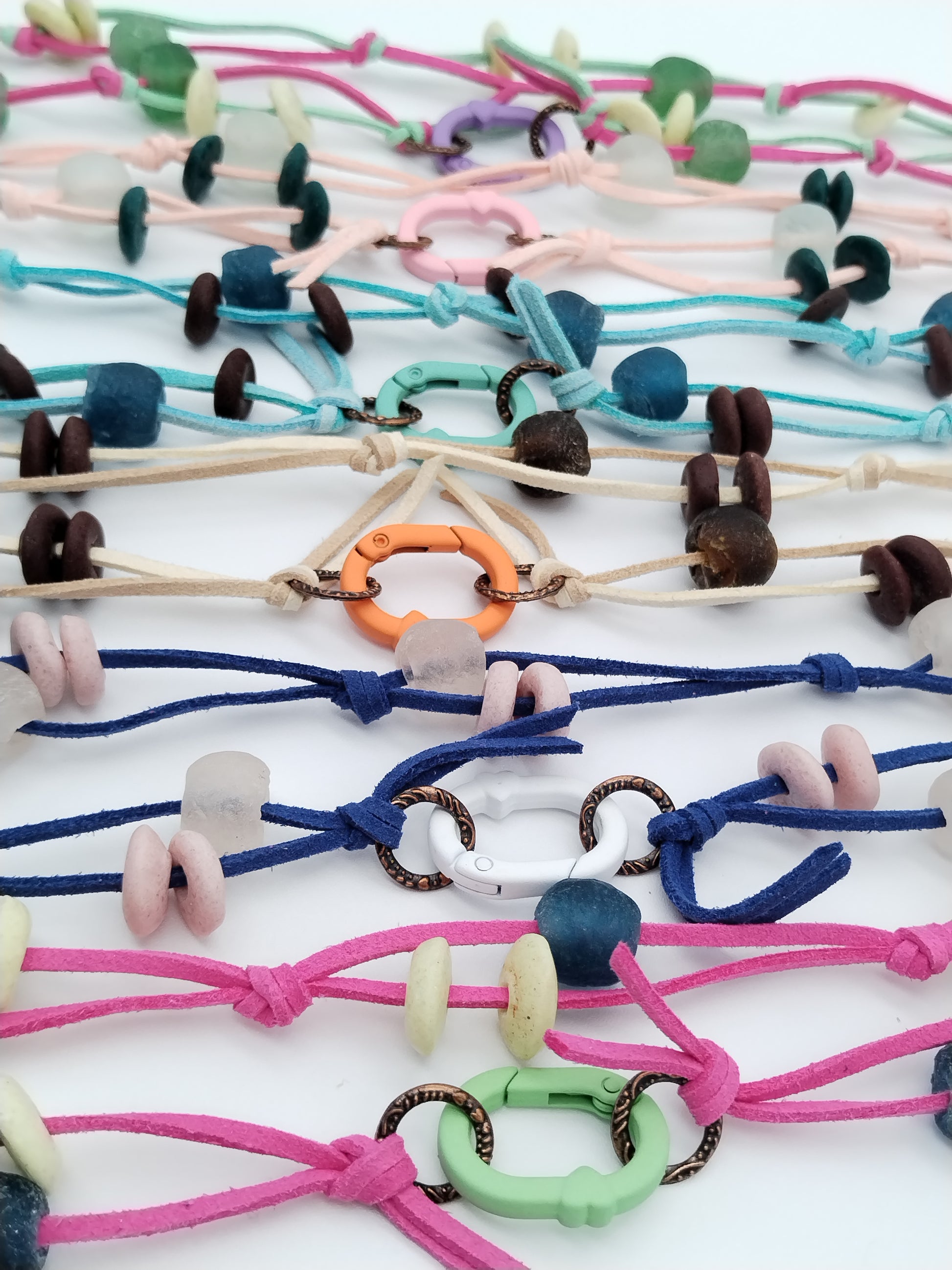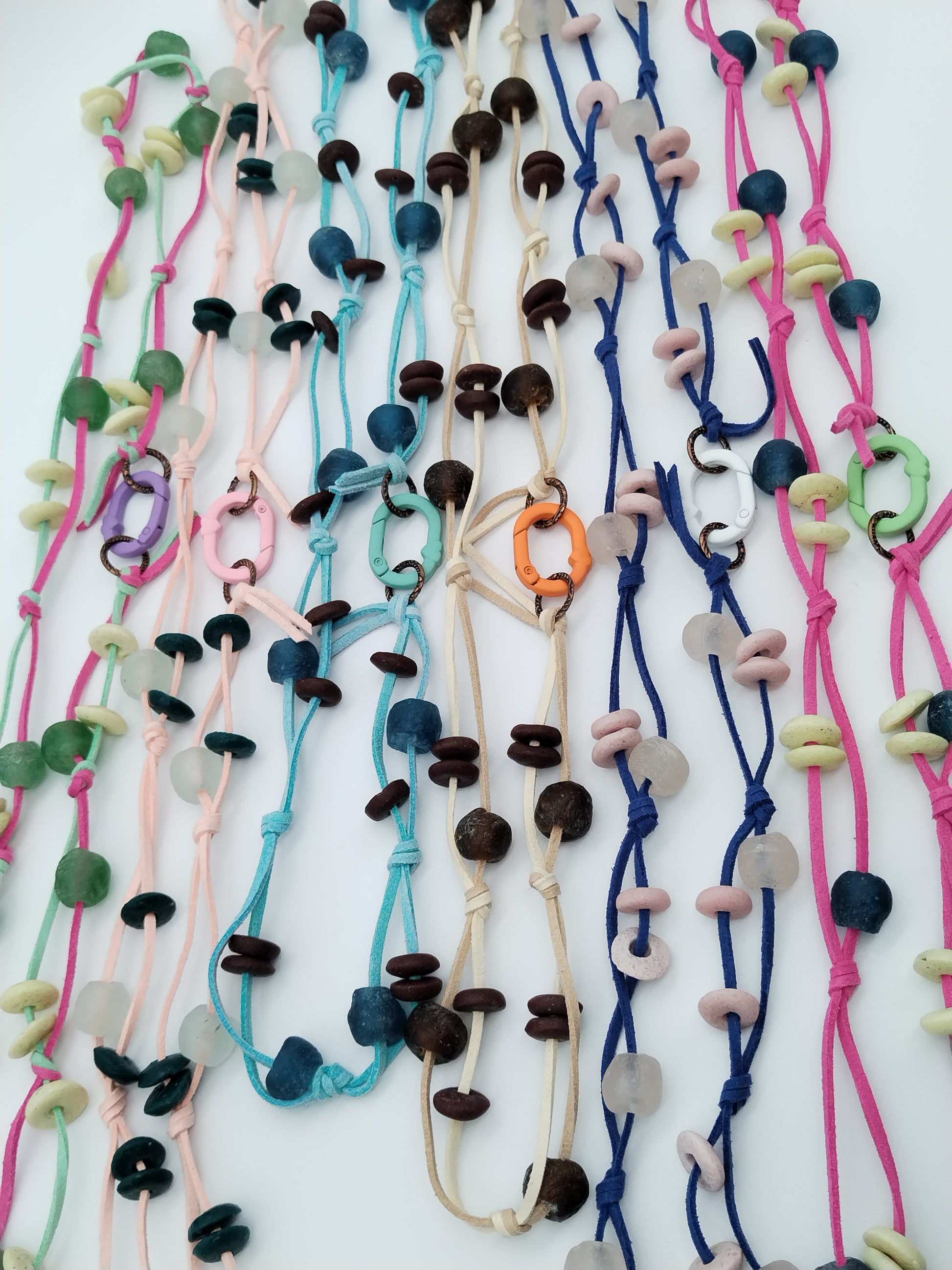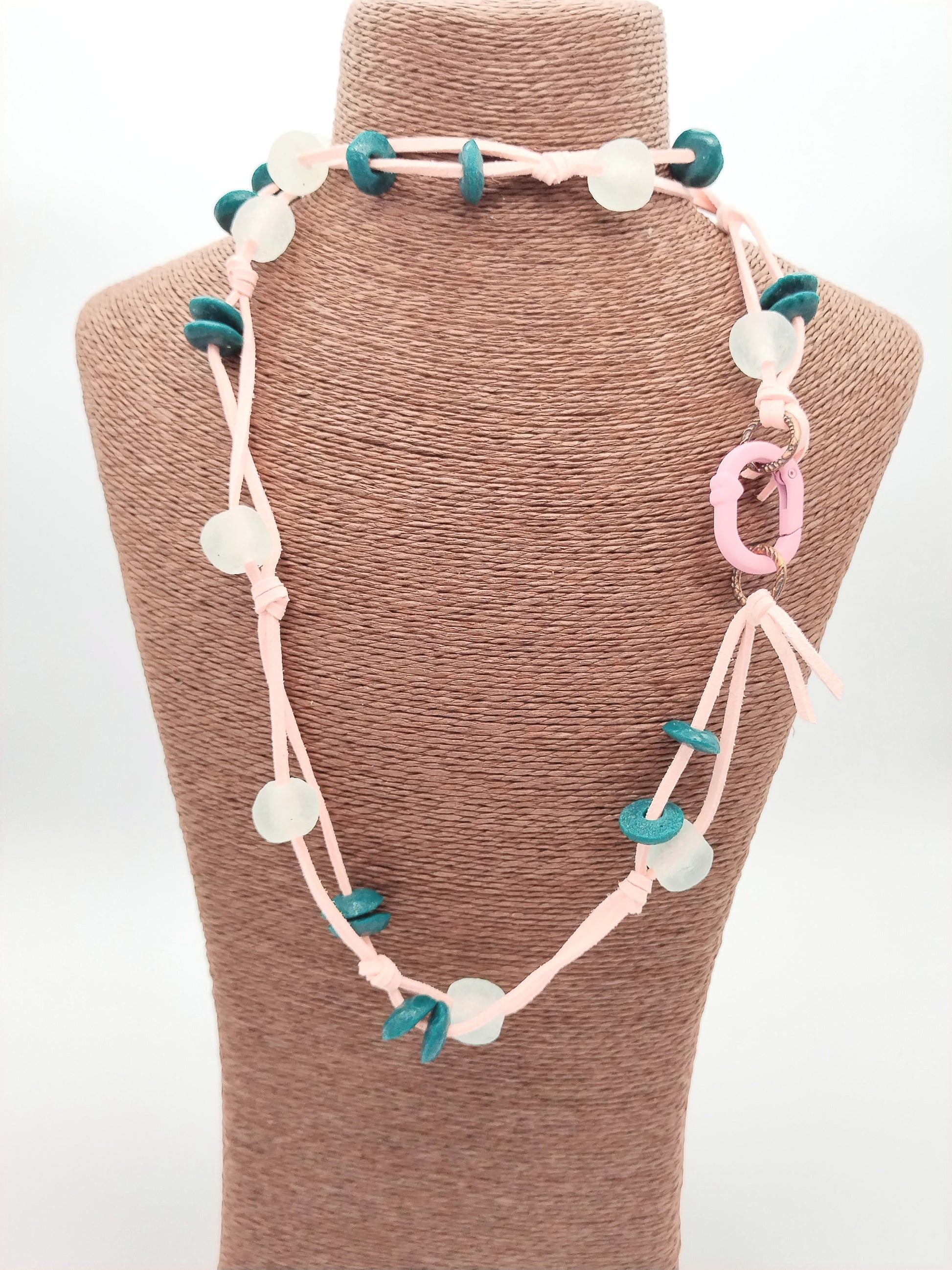 Elevate your summer style with our handmade long necklace featuring vibrant African glass beads and colorful rondelles. With multiple rows and versatile ways to wear, this boho-inspired piece exudes trendy and unique vibes. Perfect for gifts, fashion-forward girls and women, this necklace is a must-have for cool and fun summer looks. Don't miss the bold and pastel large clasp for added versatility and style. Available in various color combos including teal and aqua.