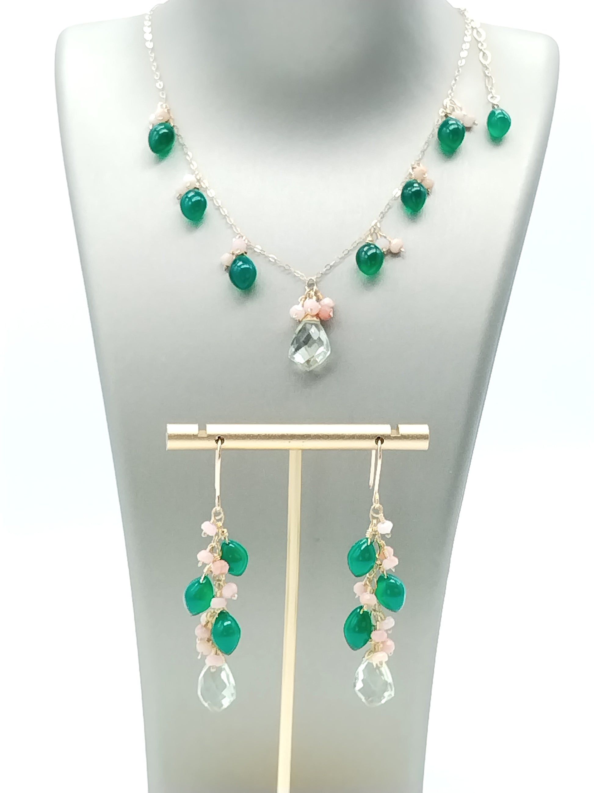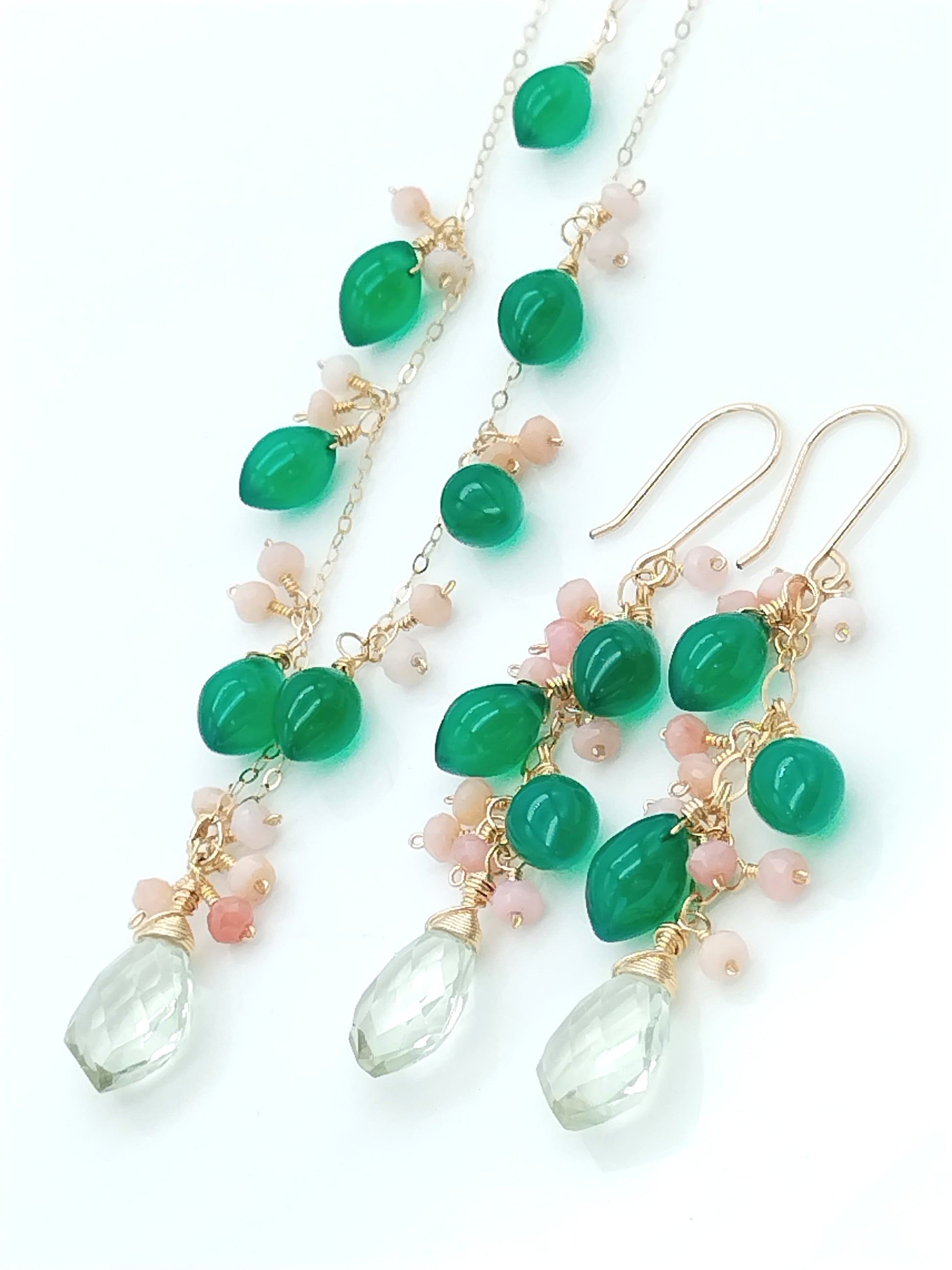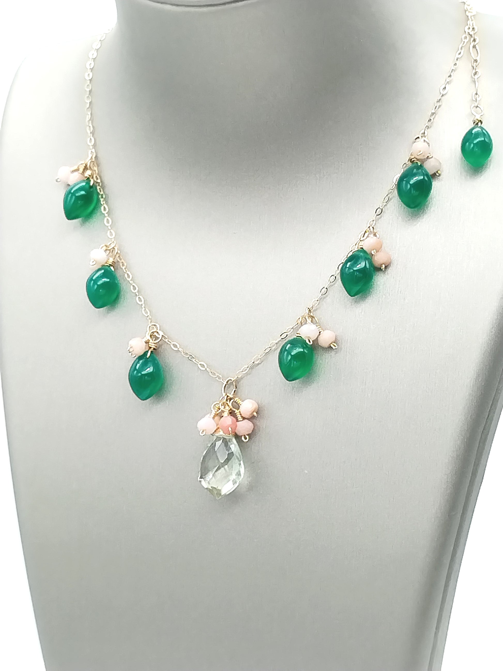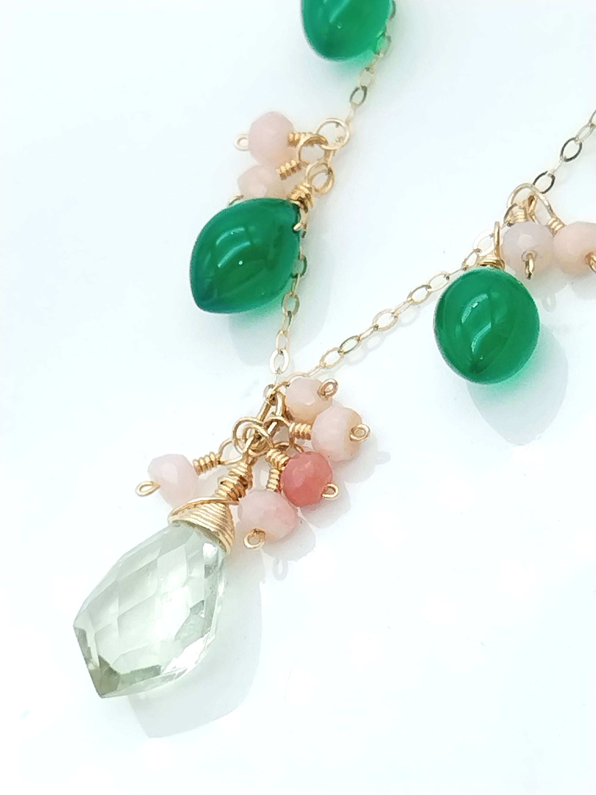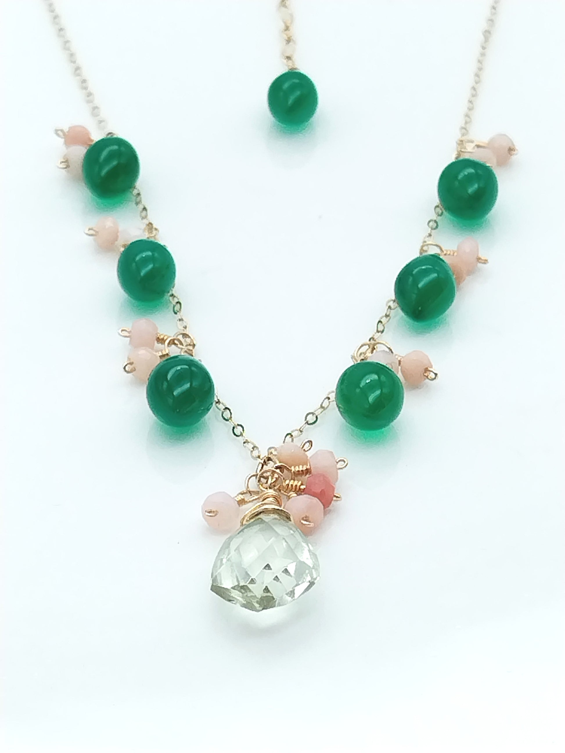 Gold Dangling Green Onyx Pink Opal & Prasiolite Gemstones Necklace