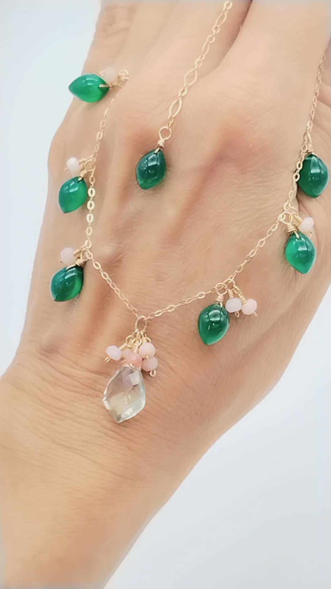 This gemstone drop choker is perfect for adding a subtle statement to your outfit. The 14k gold filled chain delicately holds Green Onyx, Prasiolite and Peruvian Pink Opal gemstones. Each stone is hand-wrapped meticulously as a dangle charm for a perfectly balanced look. Extender chain of 2" with a Green Onyx Drop hanging at the end,