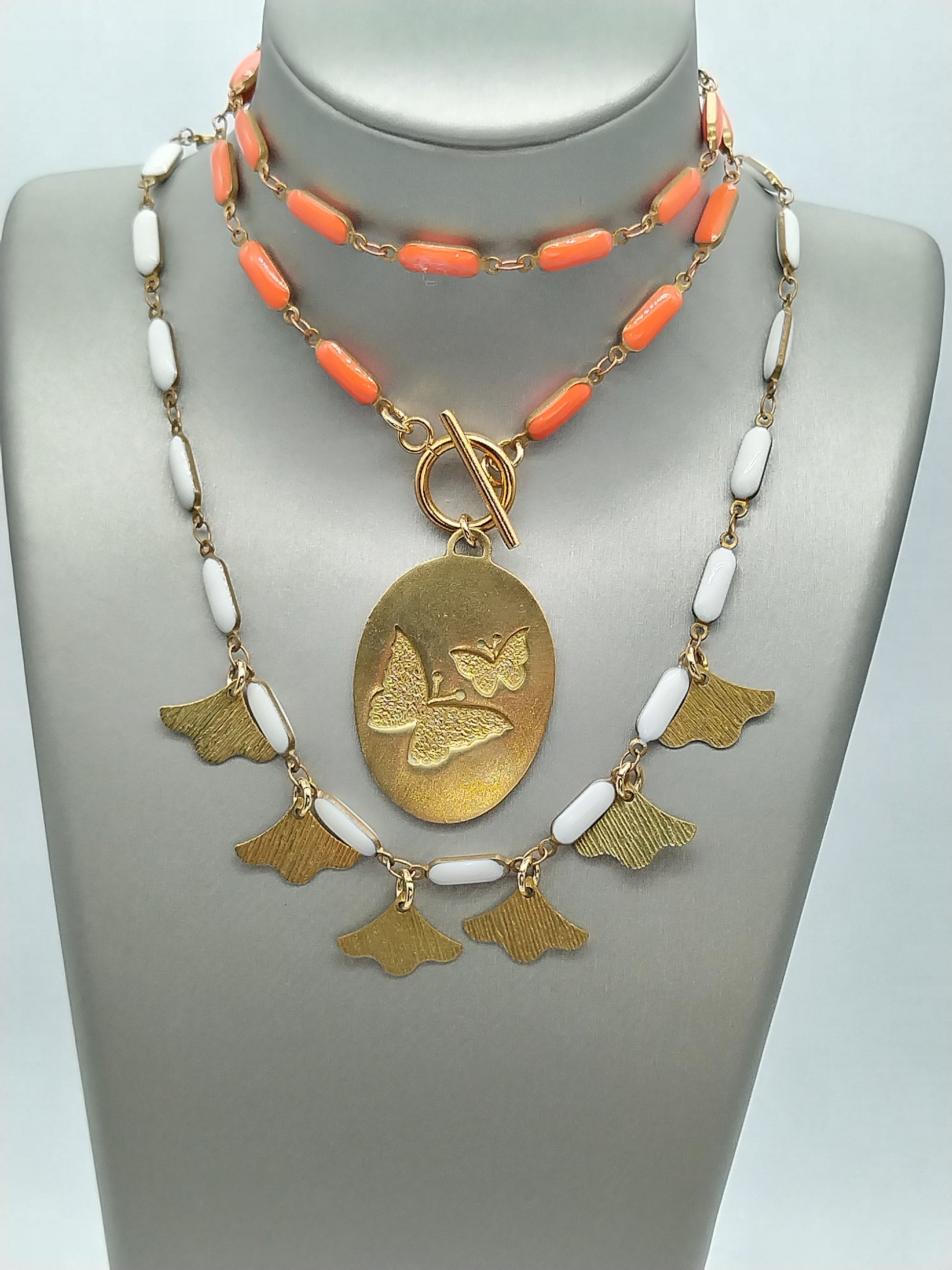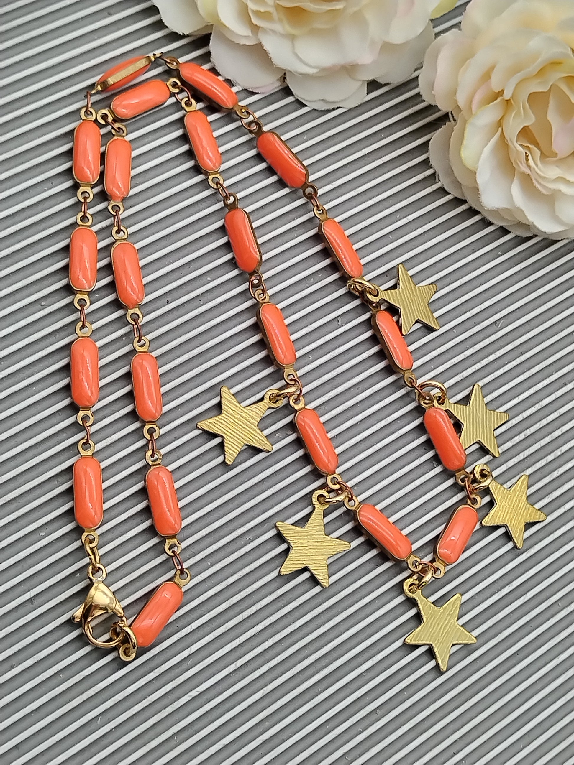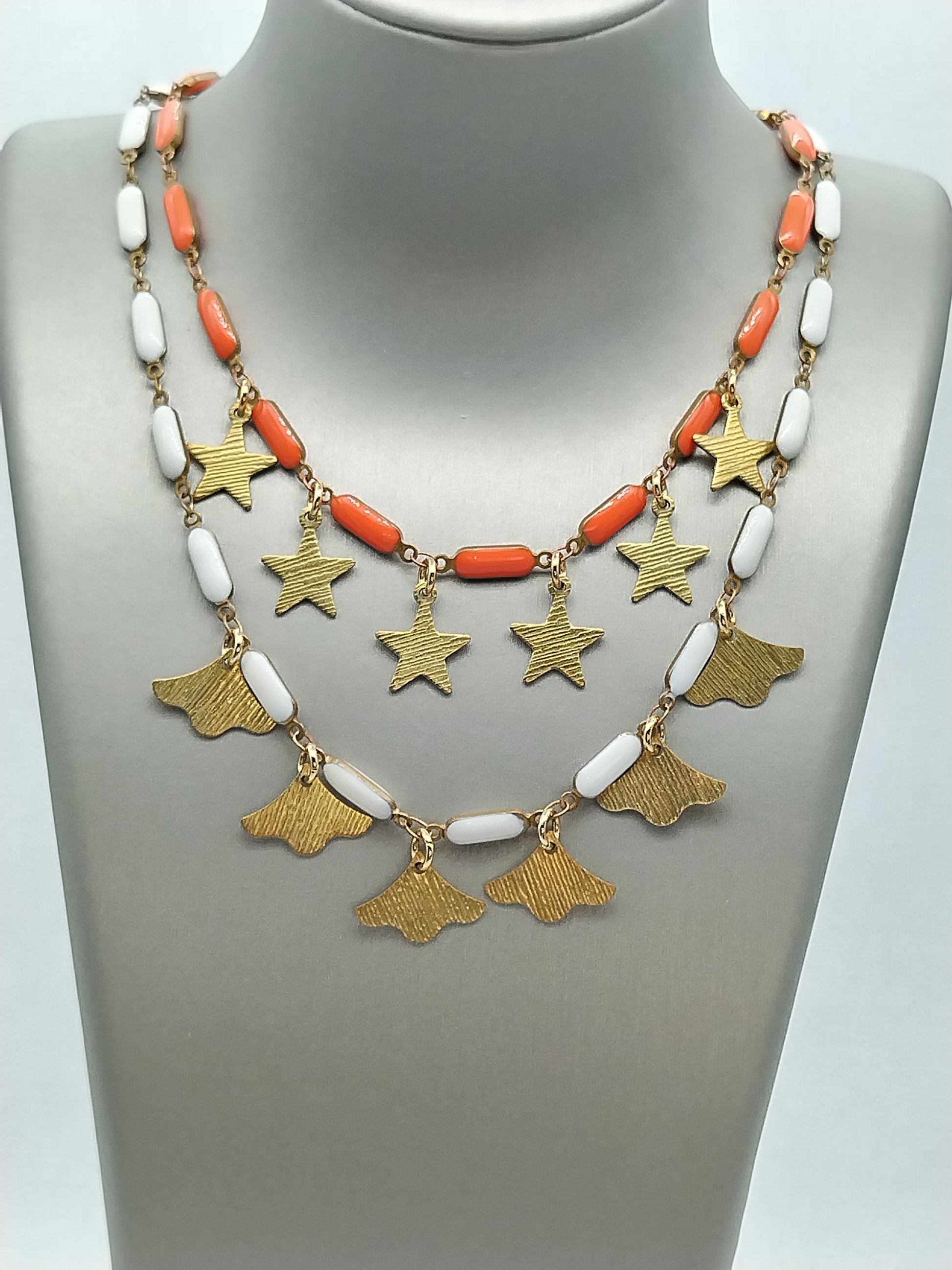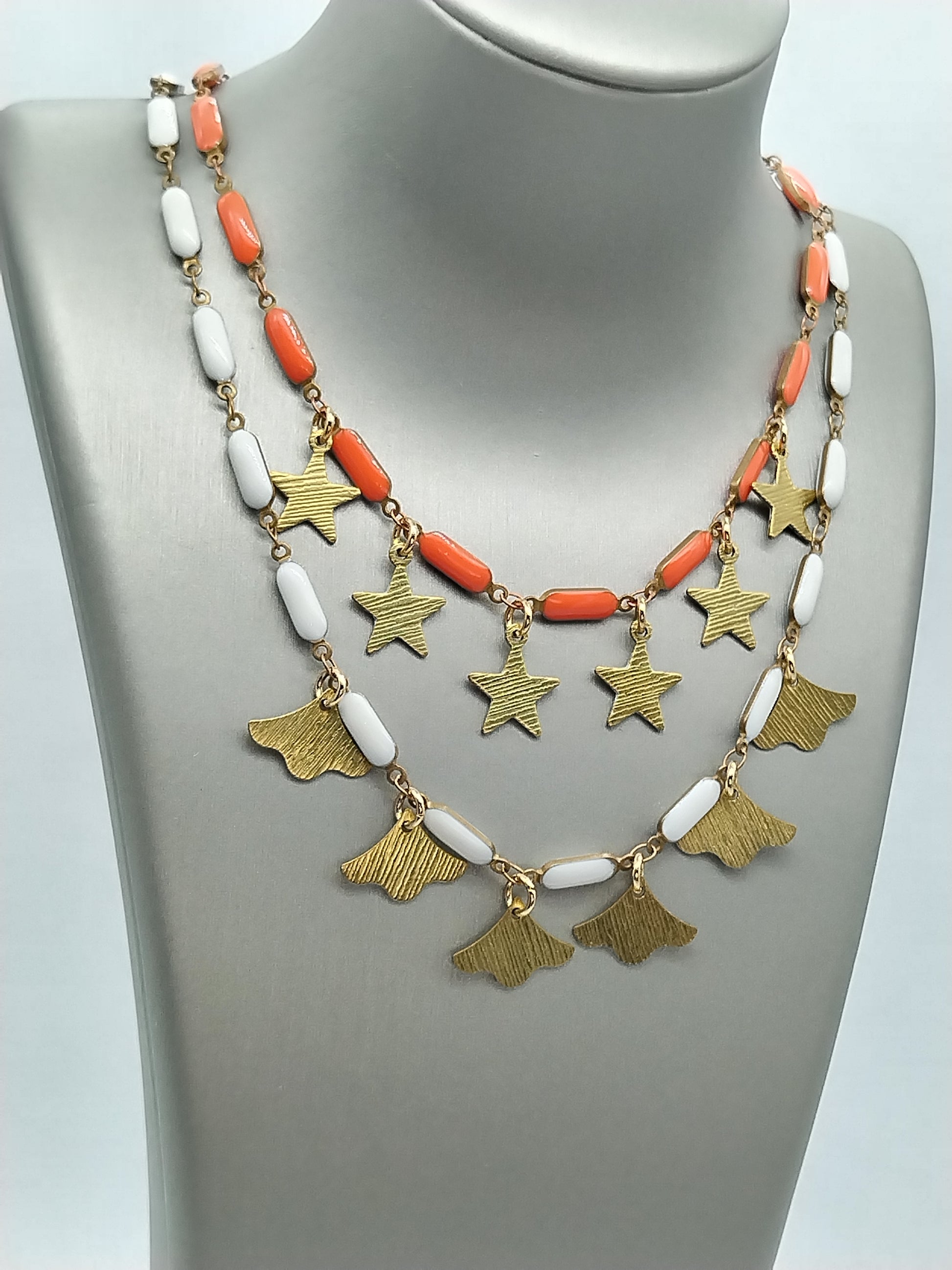 This eye-catching layering necklace features two uniquely shaped charms suspended on a lovely puffed bar chain ( white or orange enamel ). The dangle star charm and dangle gingko charm are crafted with brass and texturized for an eye-catching look. Perfect for adding a statement to your everyday outfits.
