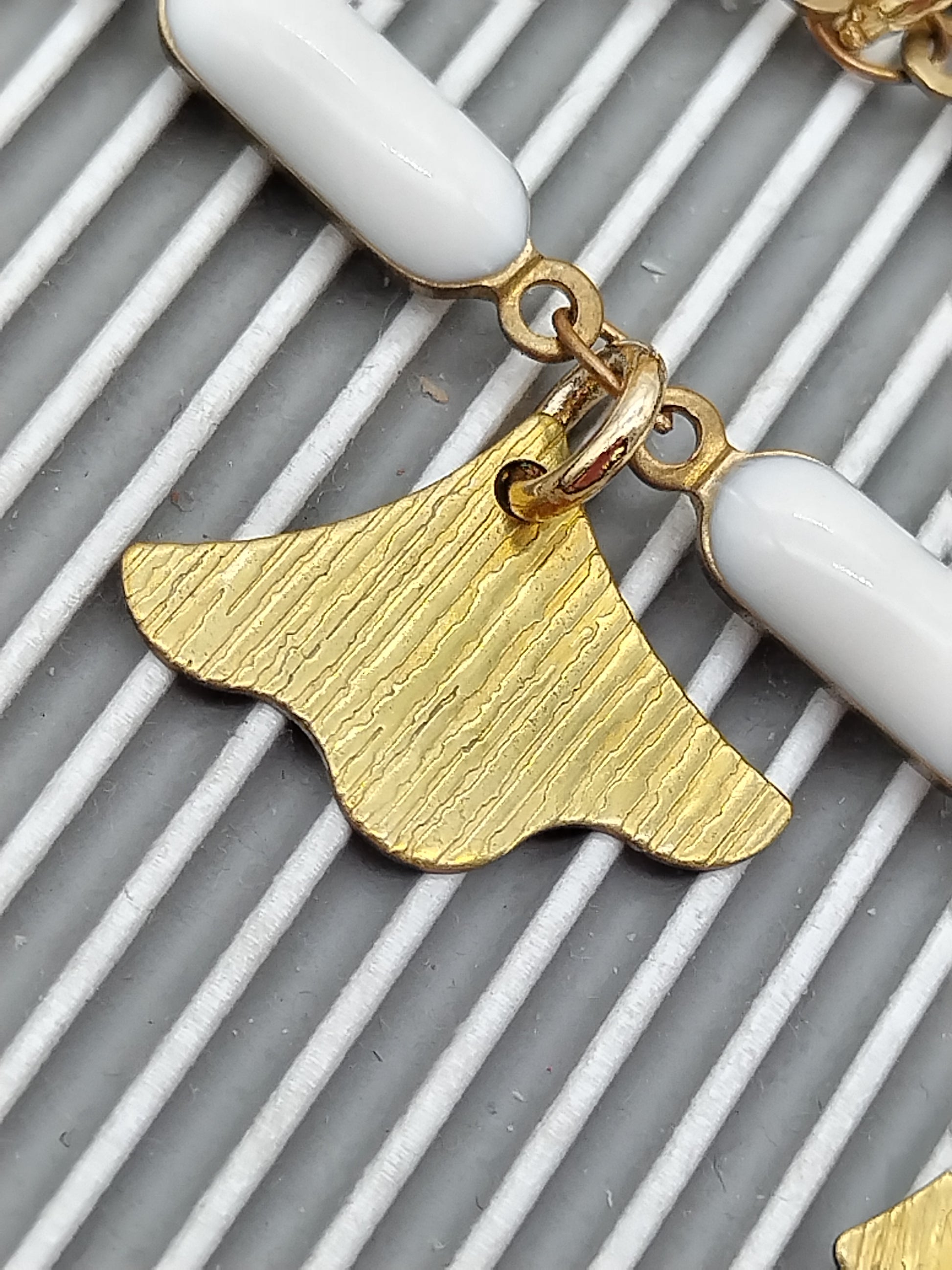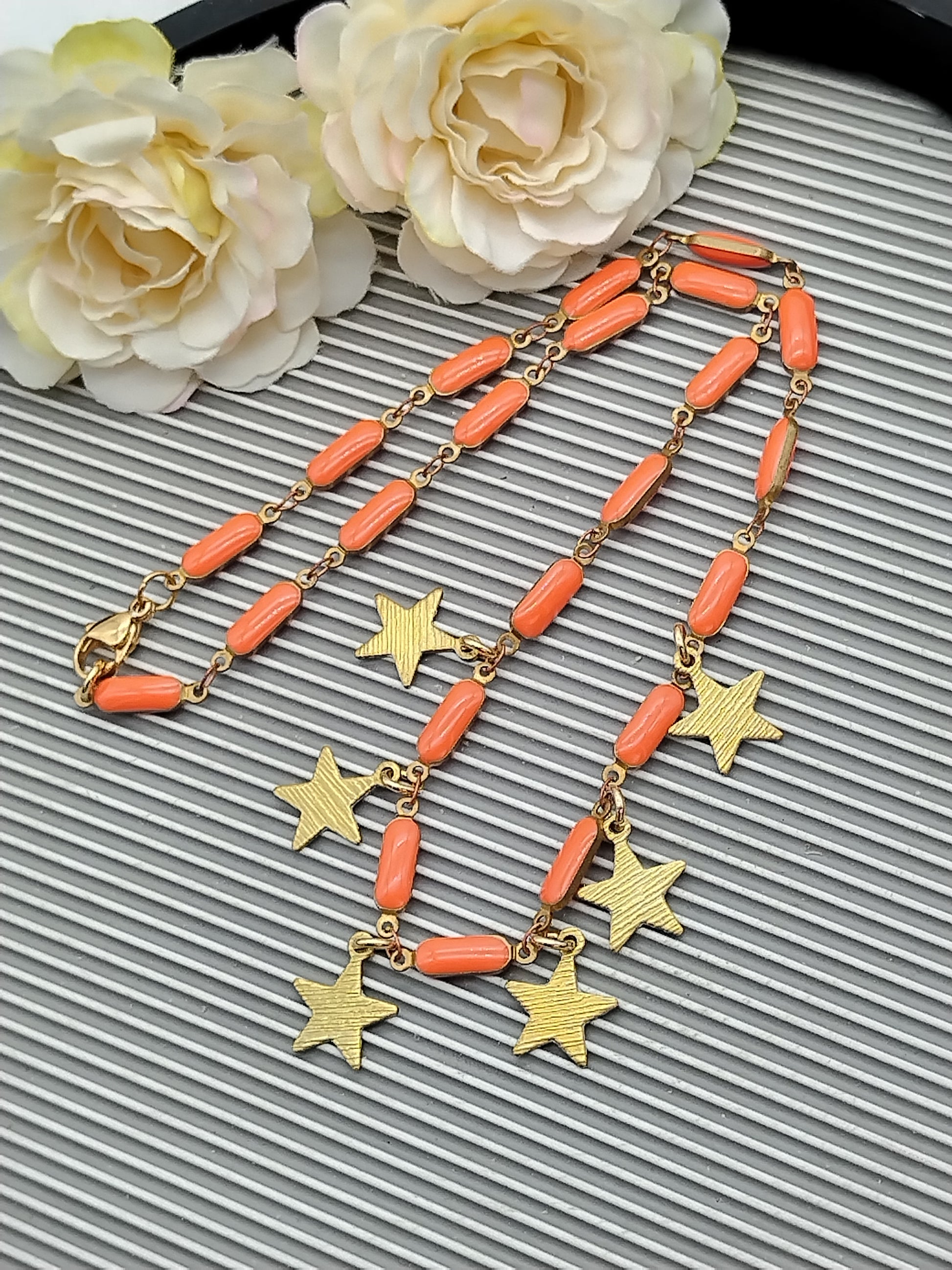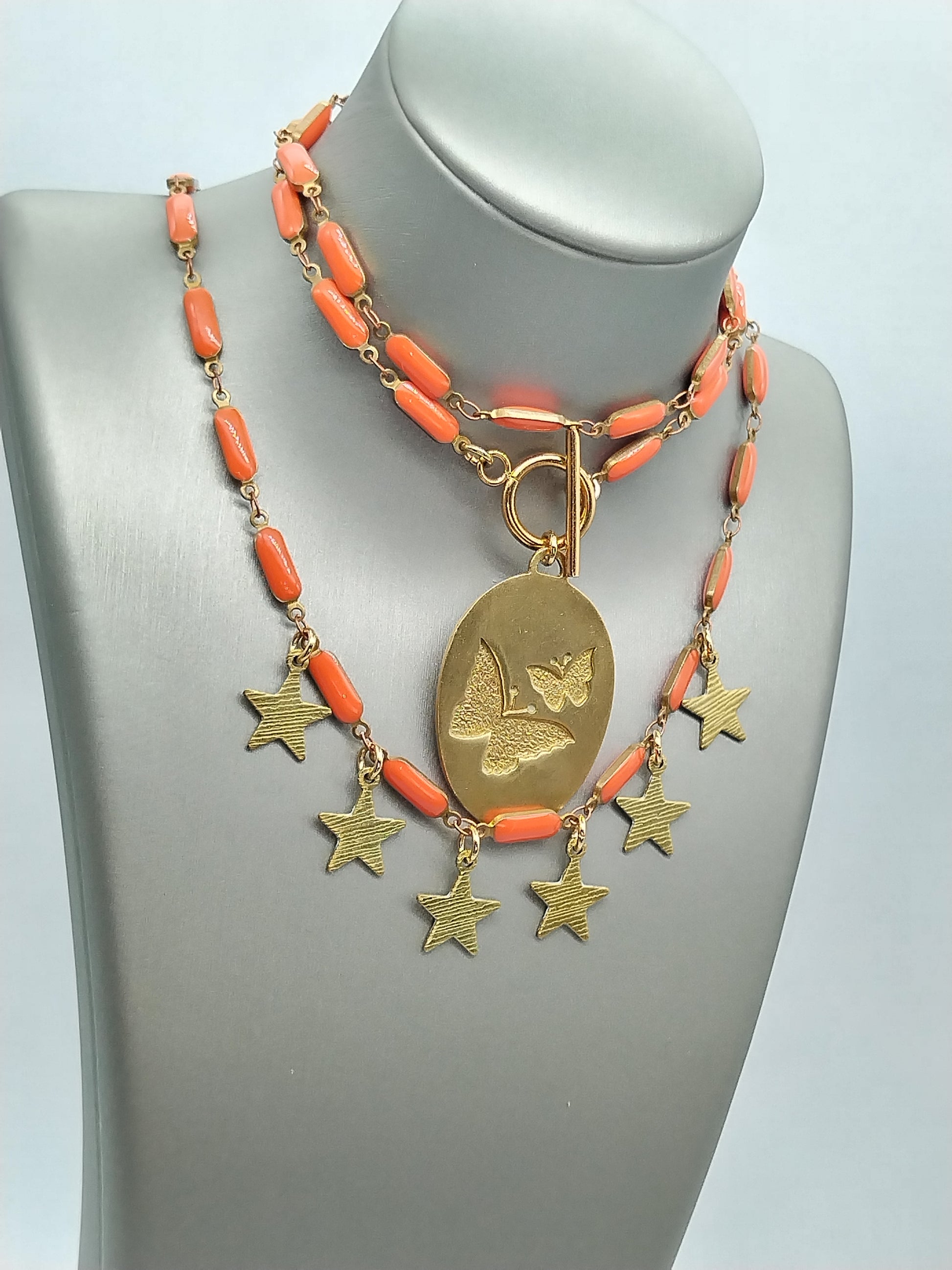 This eye-catching layering necklace features two uniquely shaped charms suspended on a lovely puffed bar chain ( white or orange enamel ). The dangle star charm and dangle gingko charm are crafted with brass and texturized for an eye-catching look. Perfect for adding a statement to your everyday outfits.