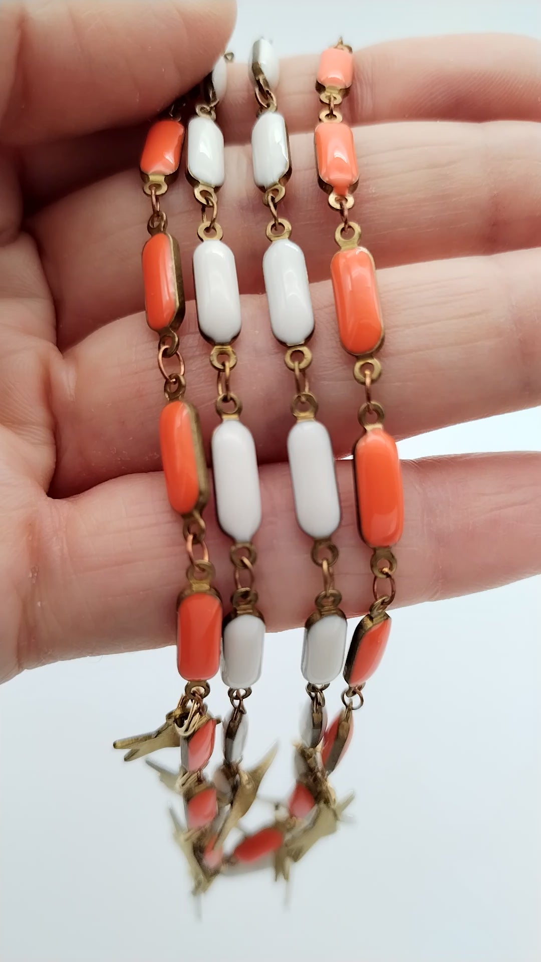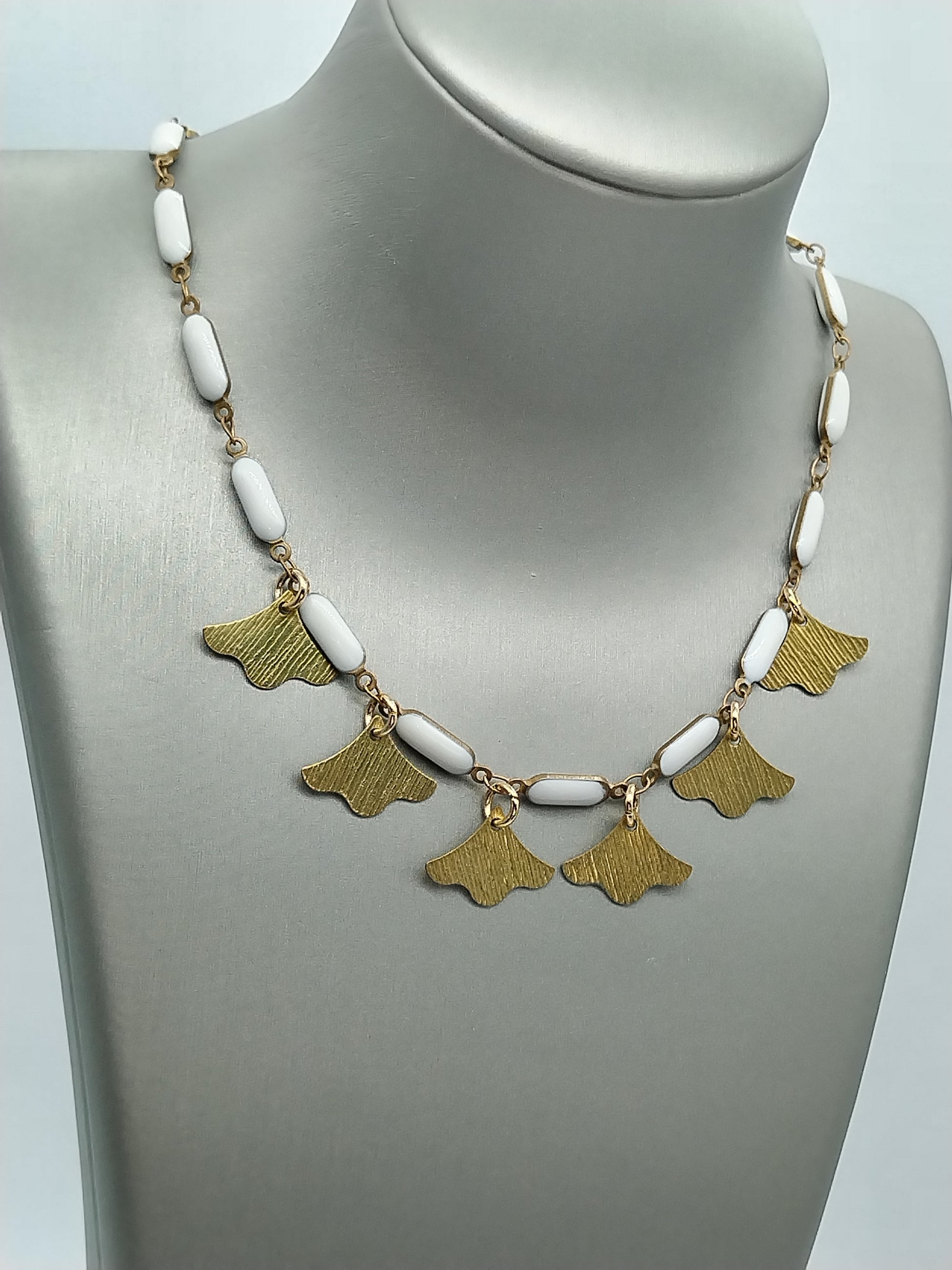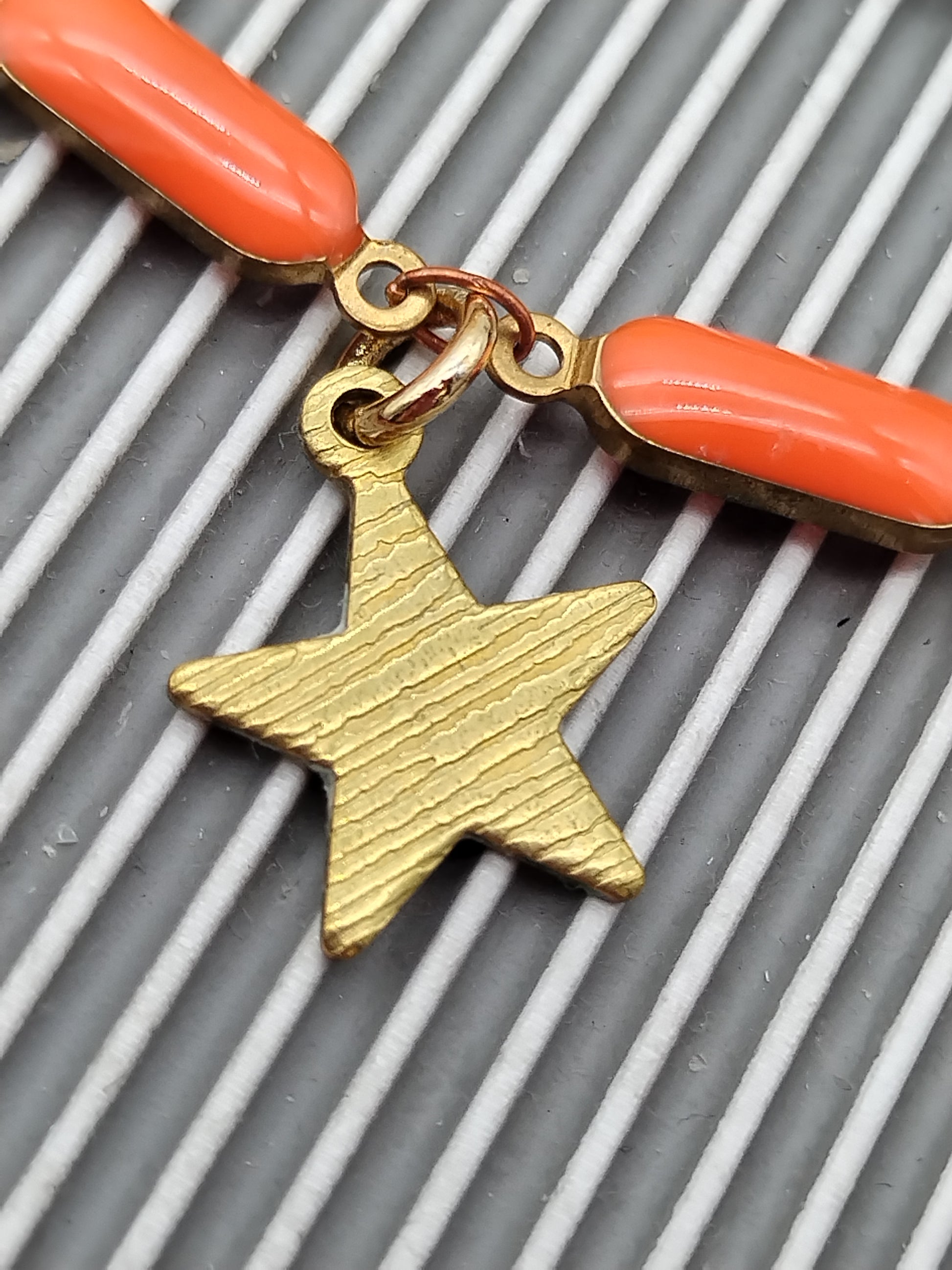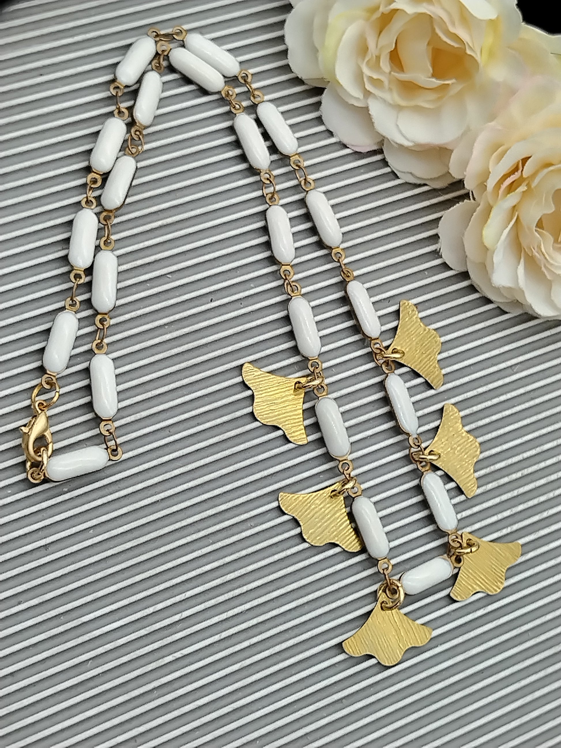This eye-catching layering necklace features two uniquely shaped charms suspended on a lovely puffed bar chain ( white or orange enamel ). The dangle star charm and dangle gingko charm are crafted with brass and texturized for an eye-catching look. Perfect for adding a statement to your everyday outfits.