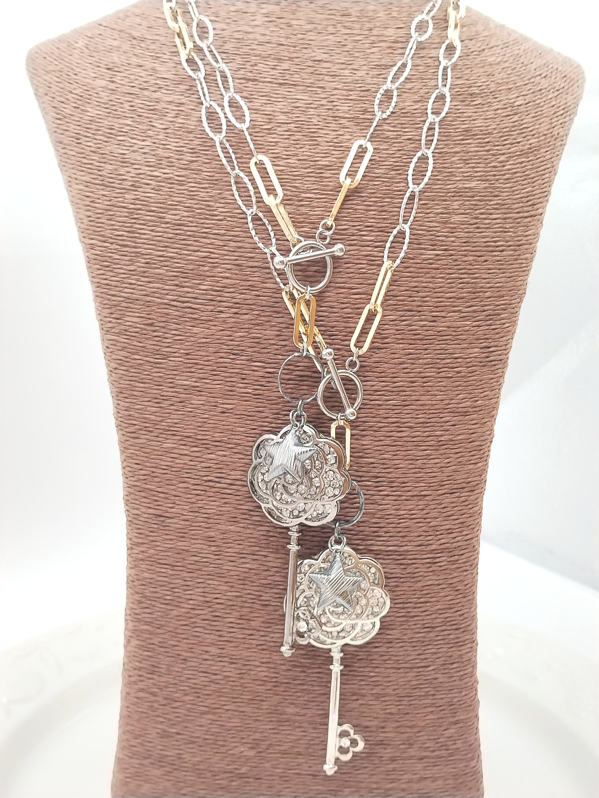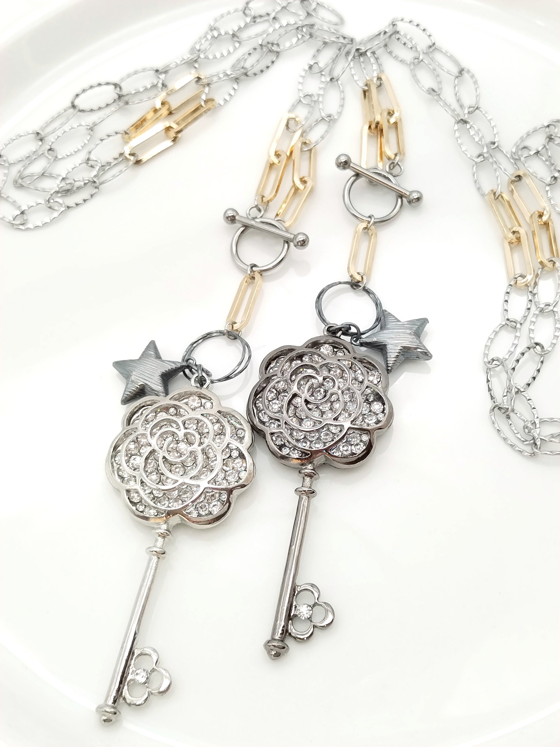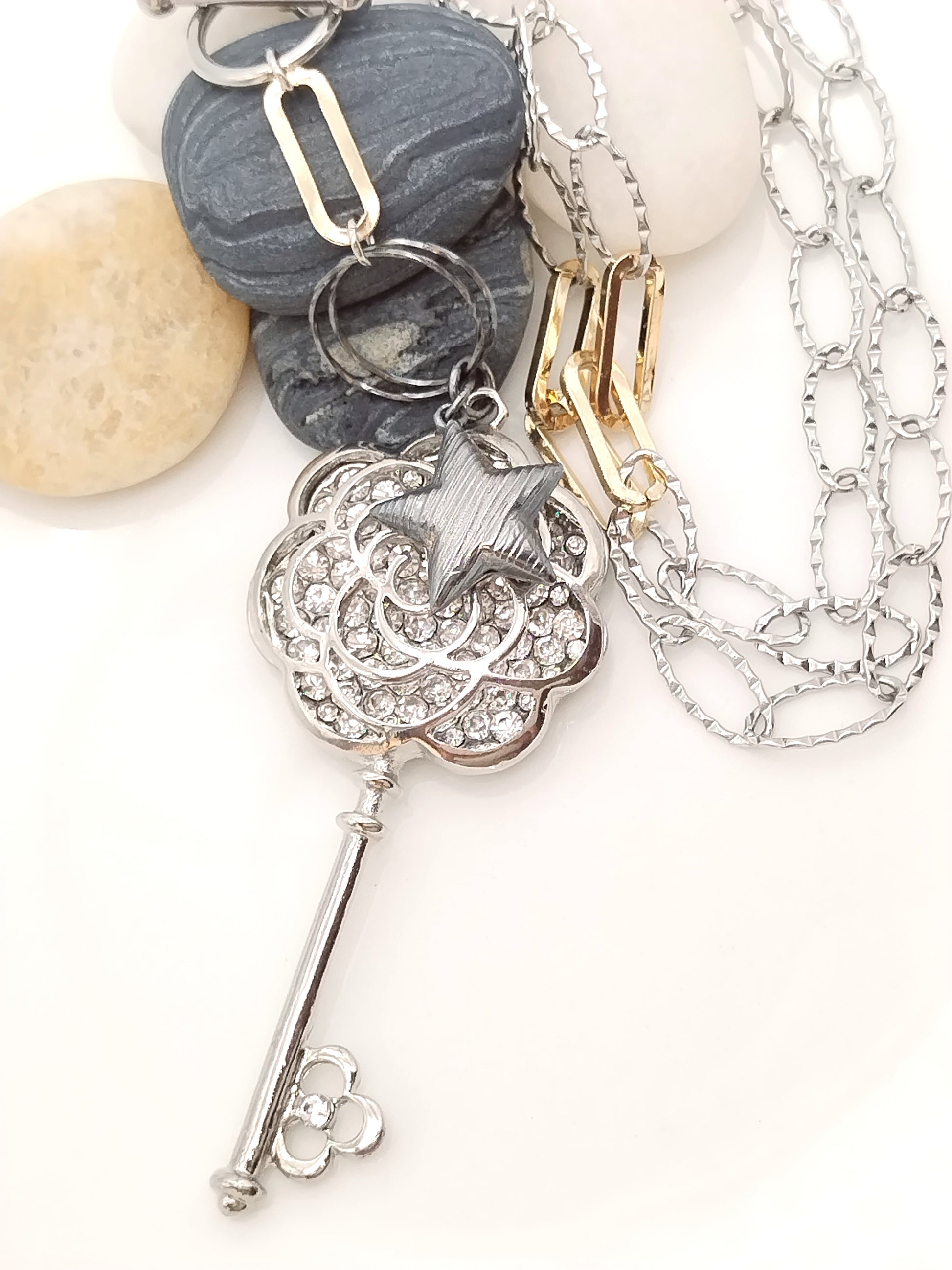 Statement Long Necklace, Key Star Pendant, Mixed Metal Chain, Trending Jewelry, Gift, For her