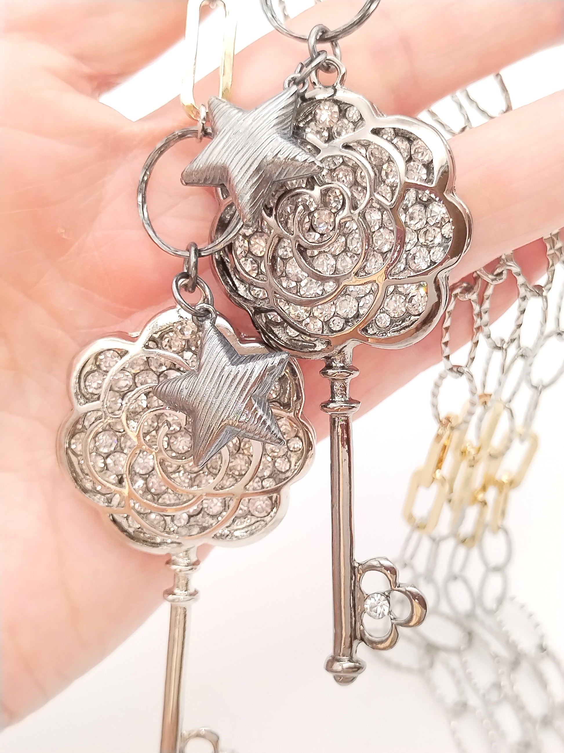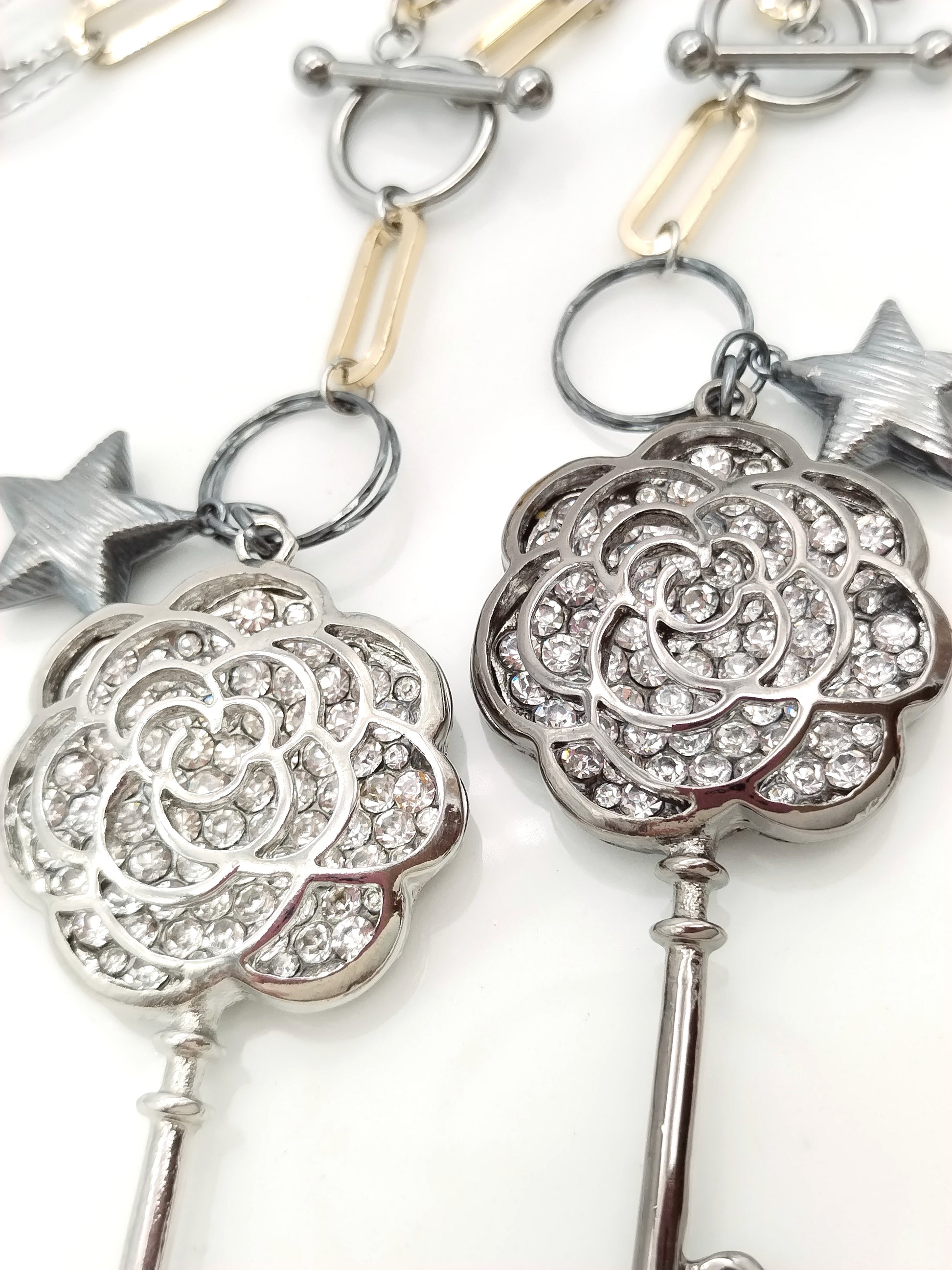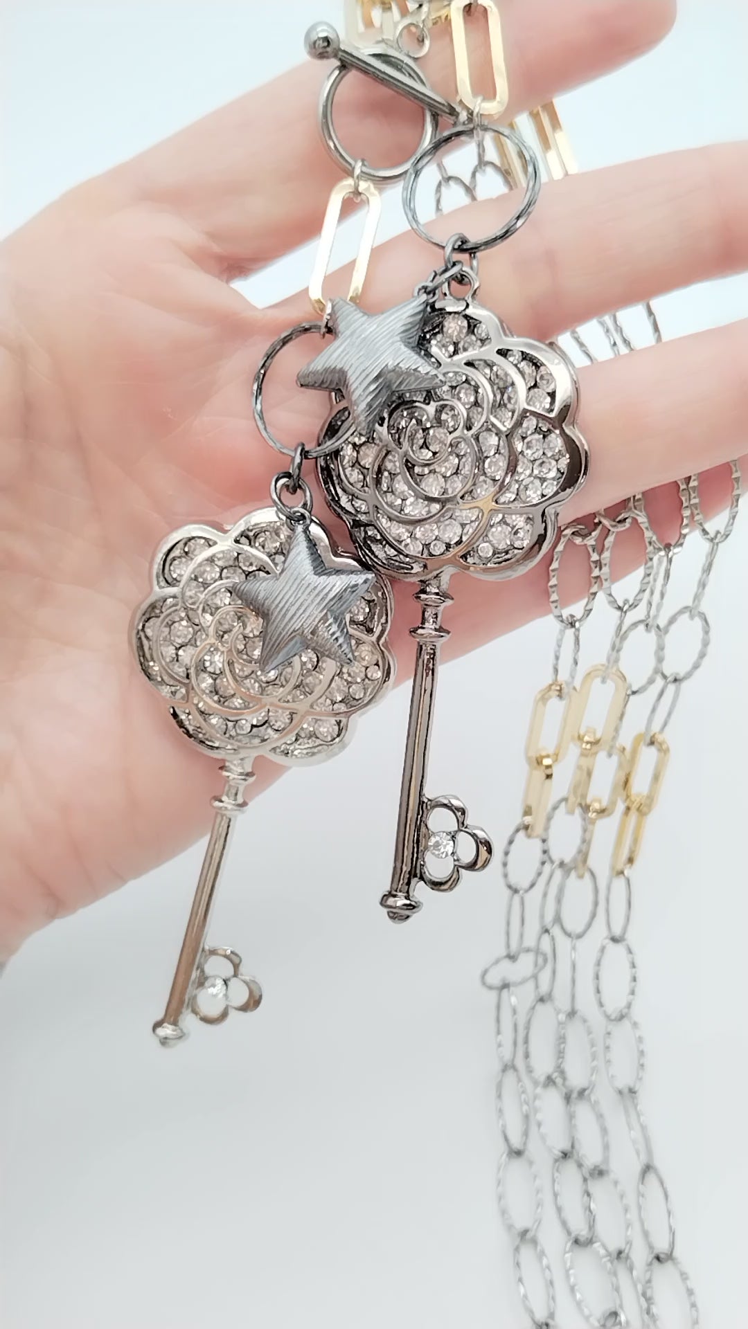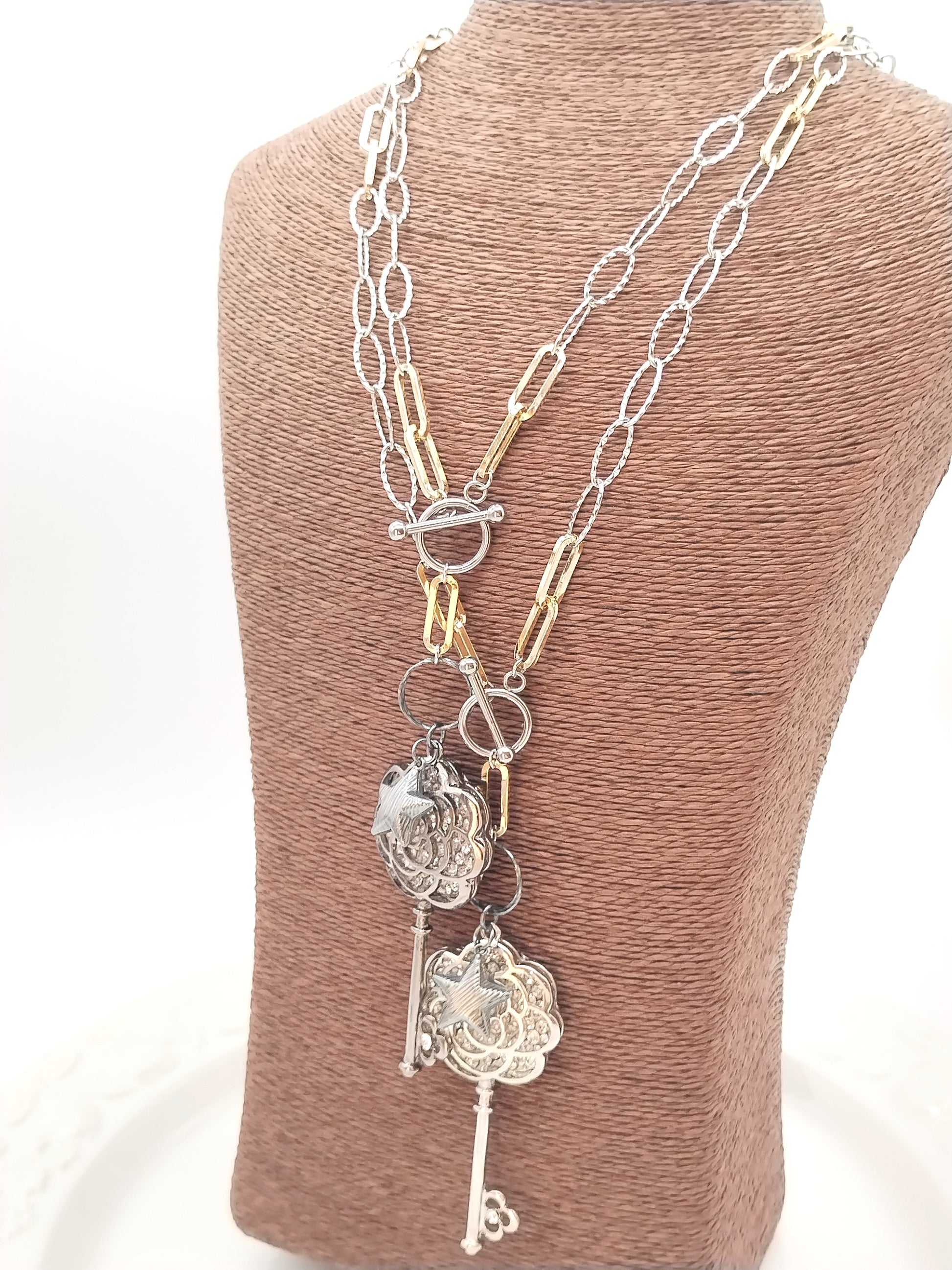 Statement Long Necklace, Key Star Pendant, Mixed Metal Chain, Trending Jewelry, Gift, For her