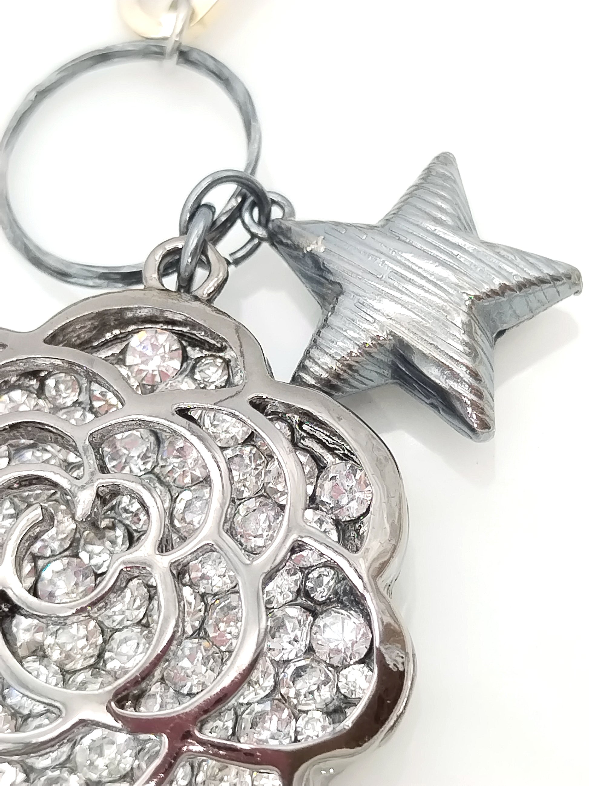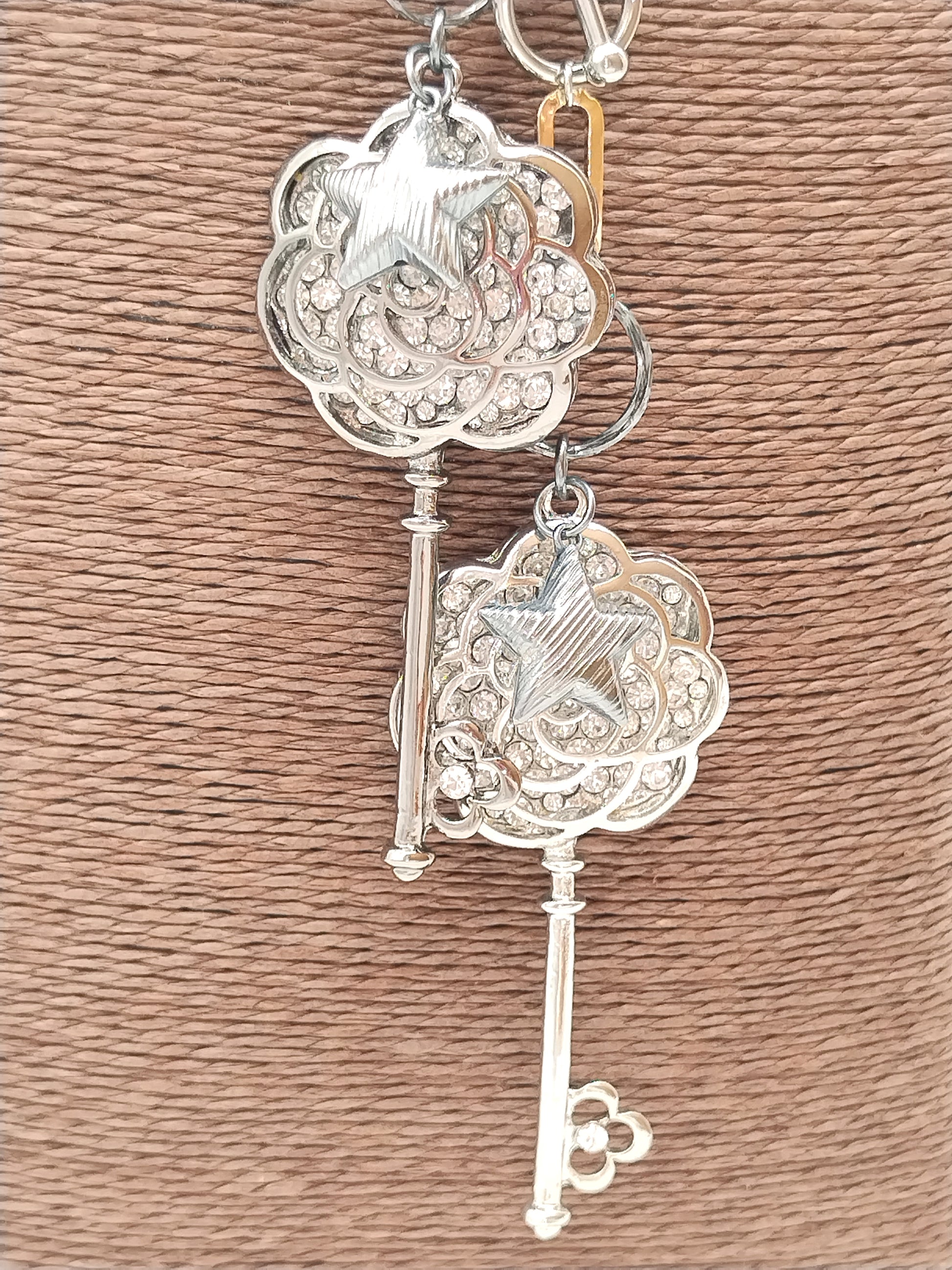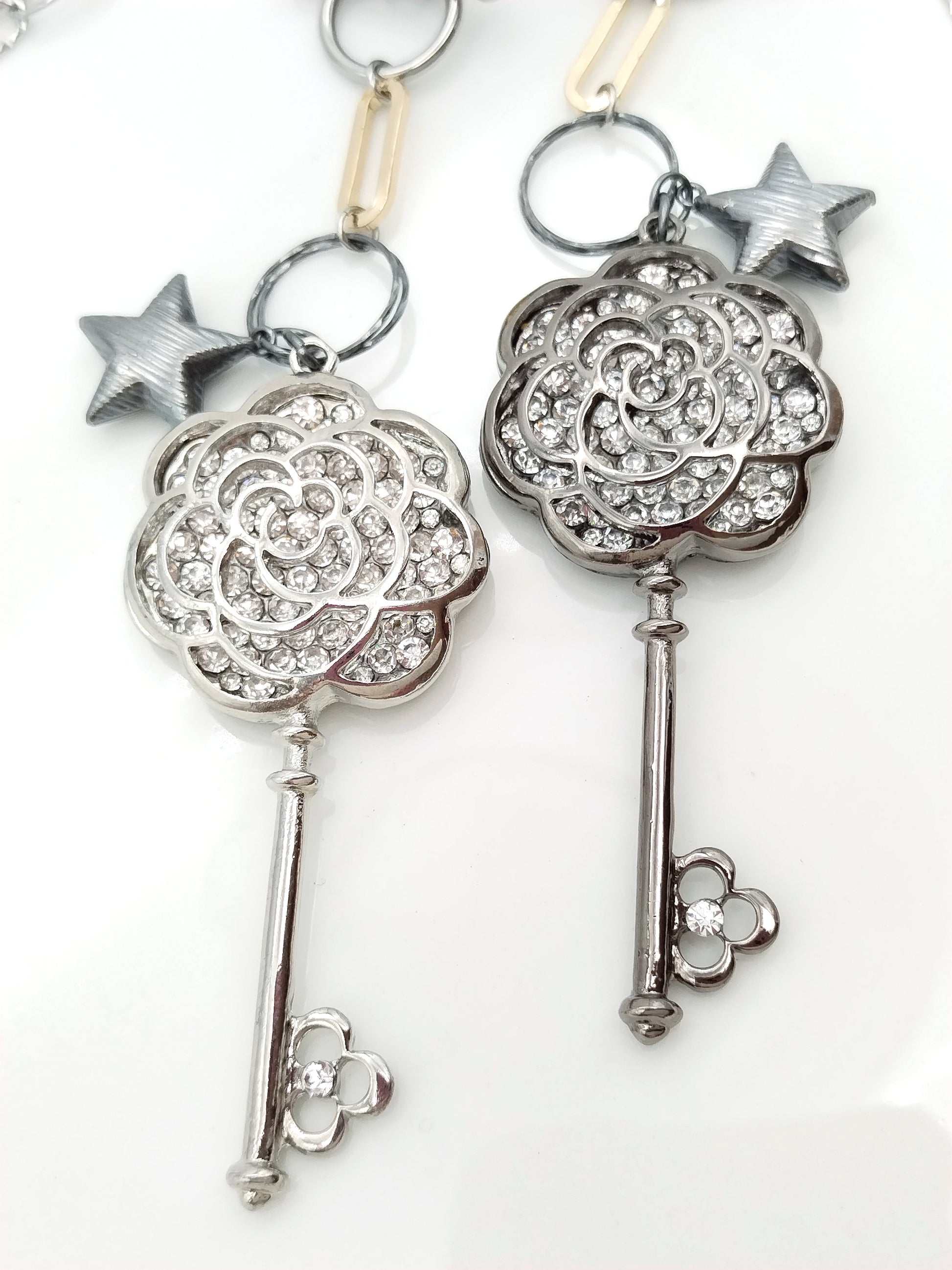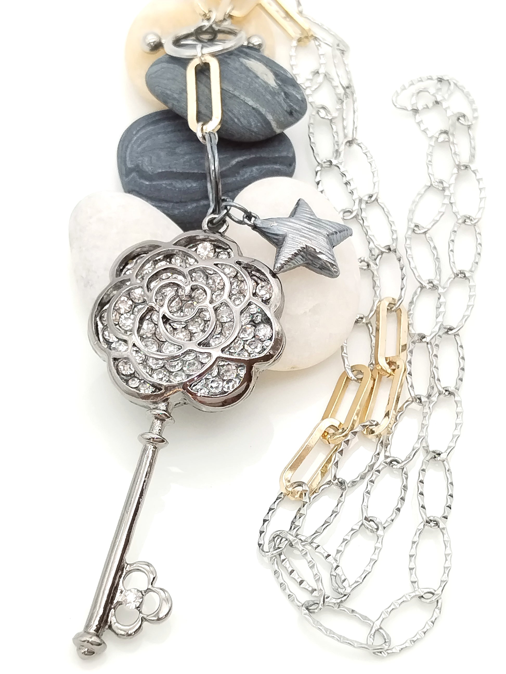 Statement Long Necklace, Key Star Pendant Charm, Mixed Metal Chain, Trending Jewelry, Gift, For her