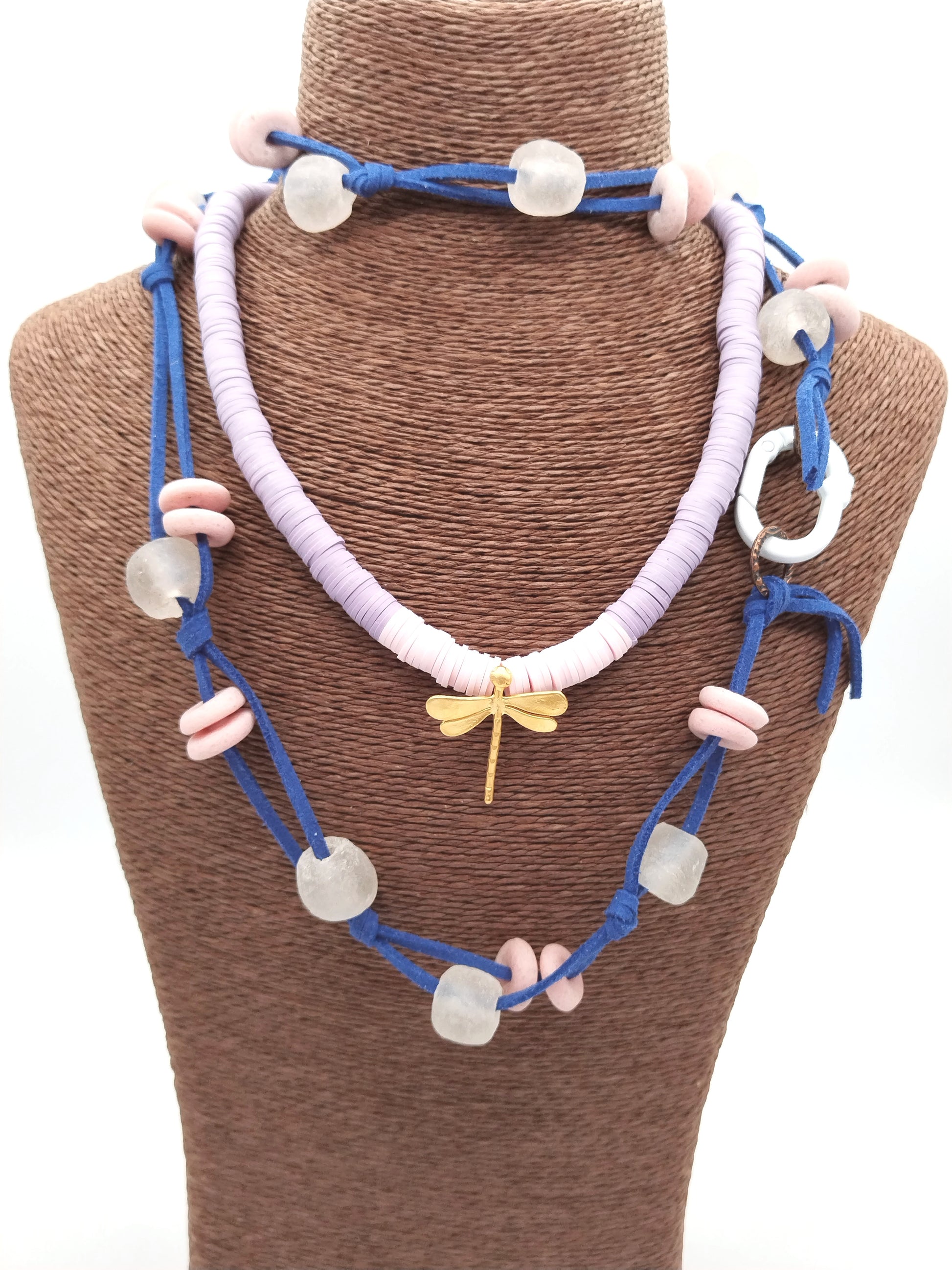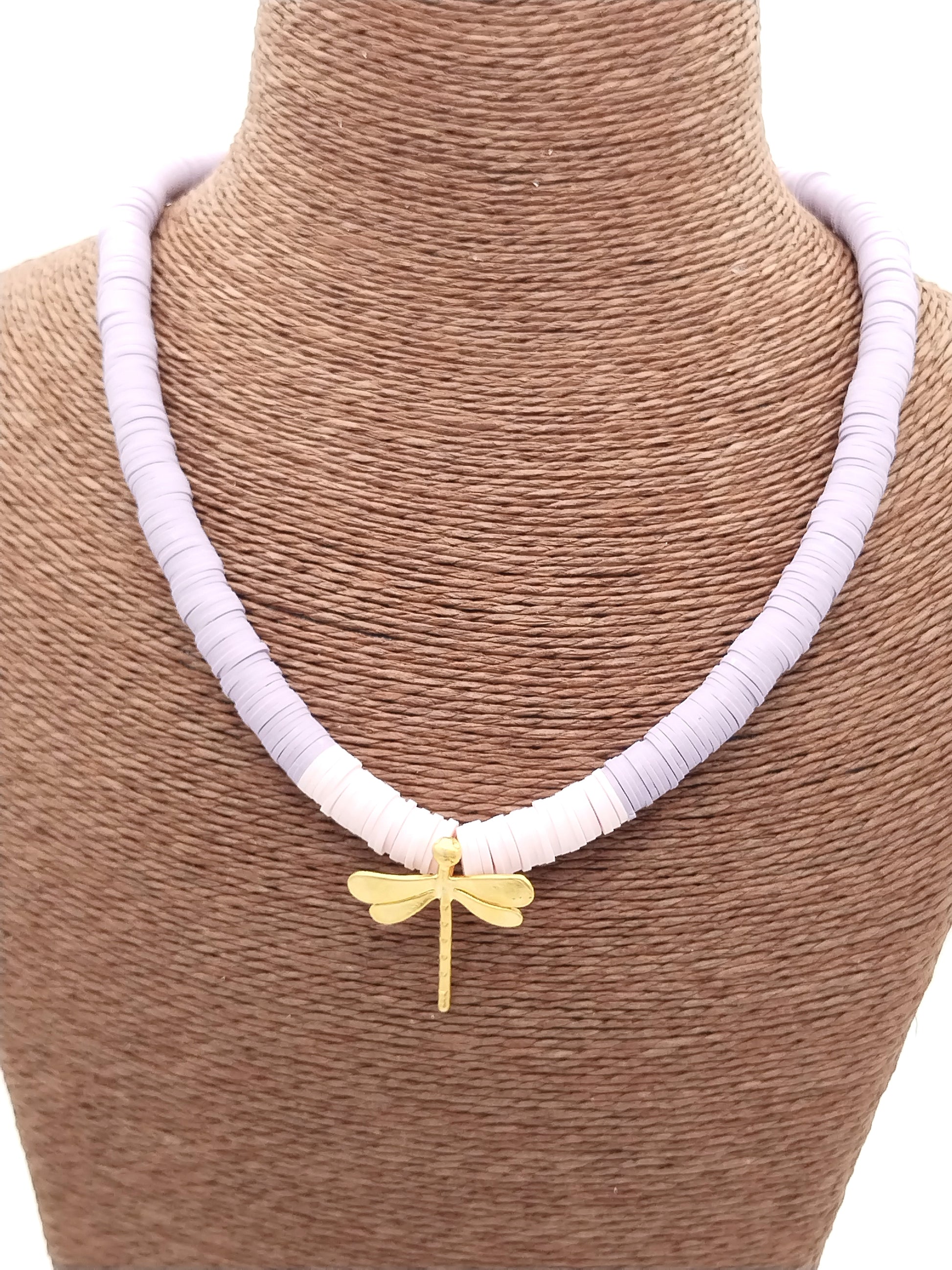 Beautiful Vinyl Heishi Necklaces with lovely Matte Gold Plated large charms. Clasp is a beautiful bronze color lobster