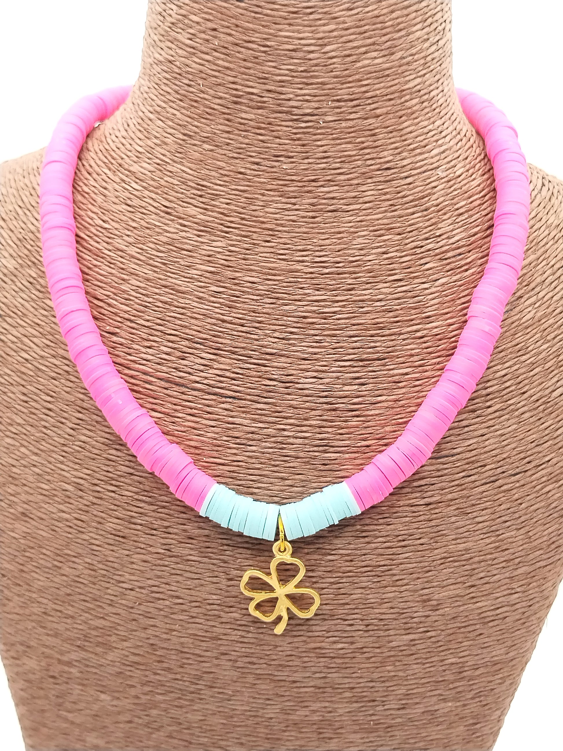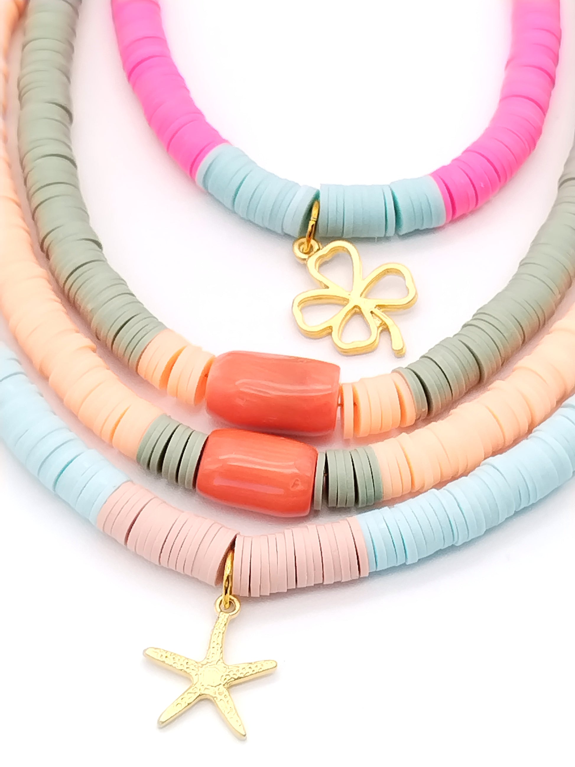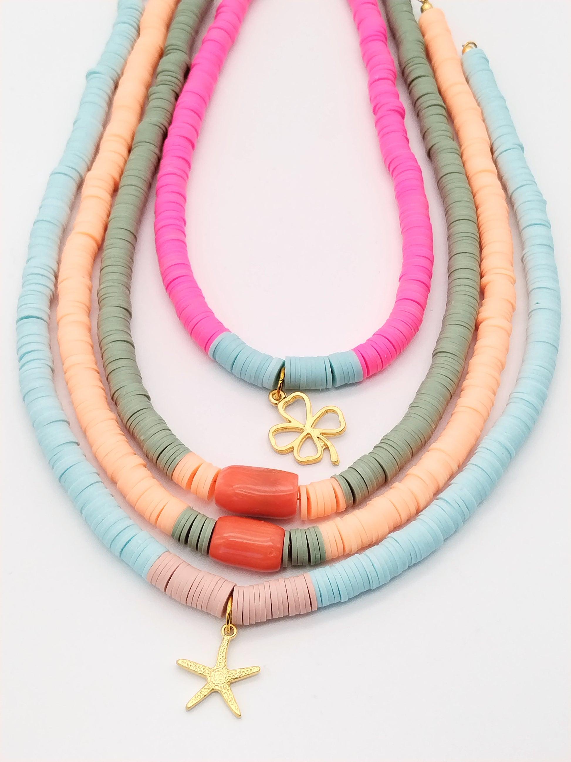 Vinyl Heishi Necklace with Matte Gold Charm. Colorful Necklace