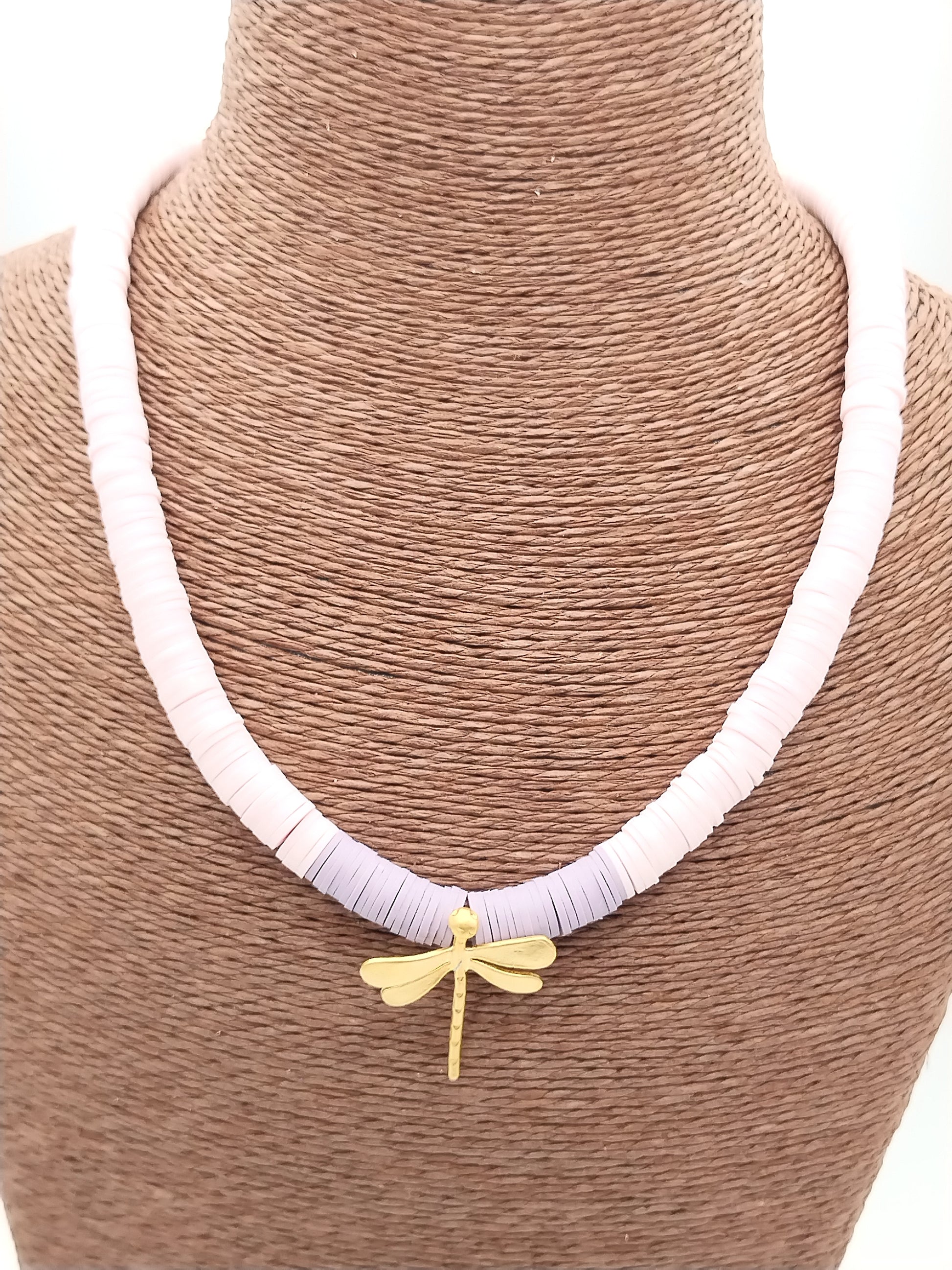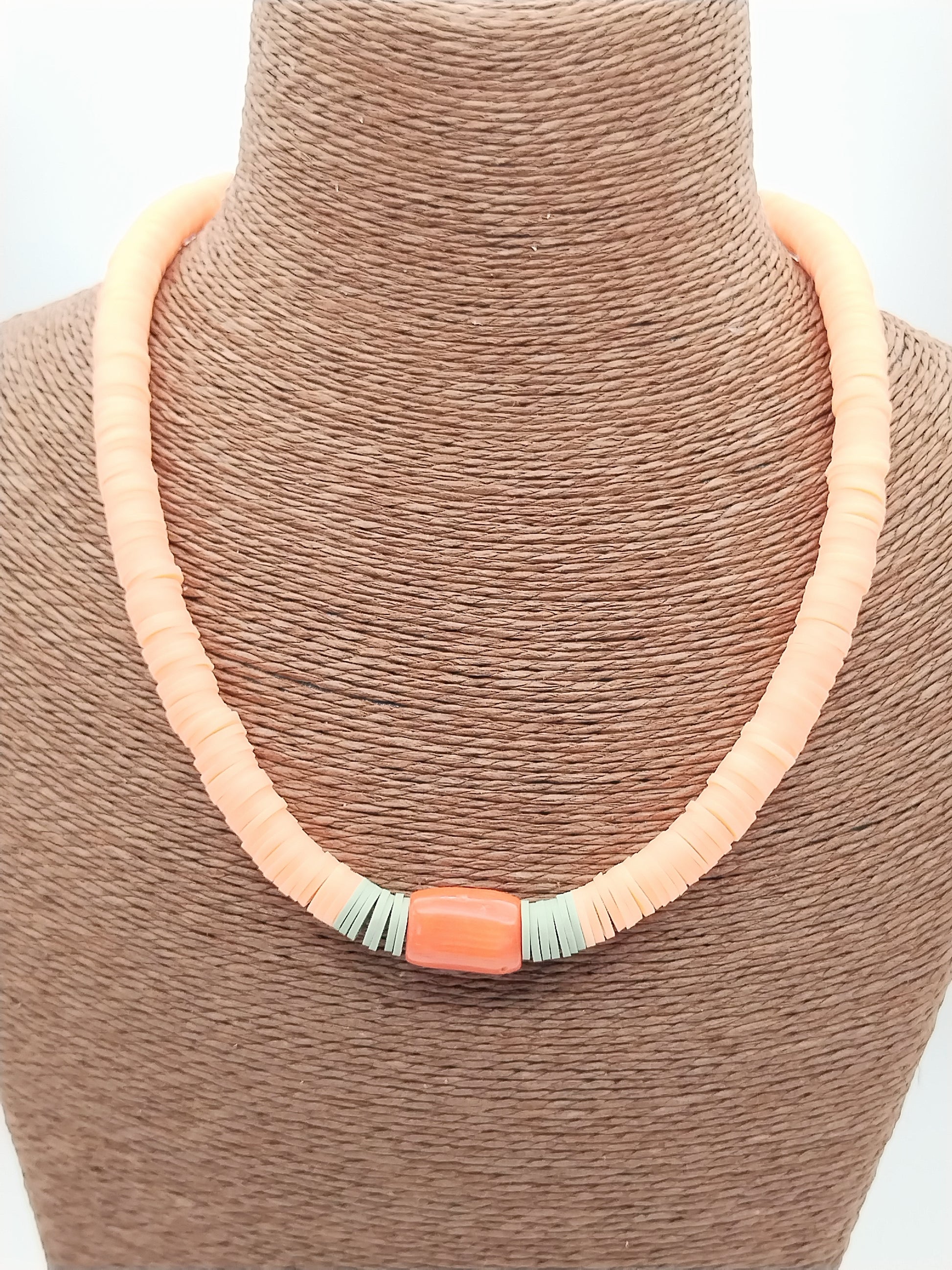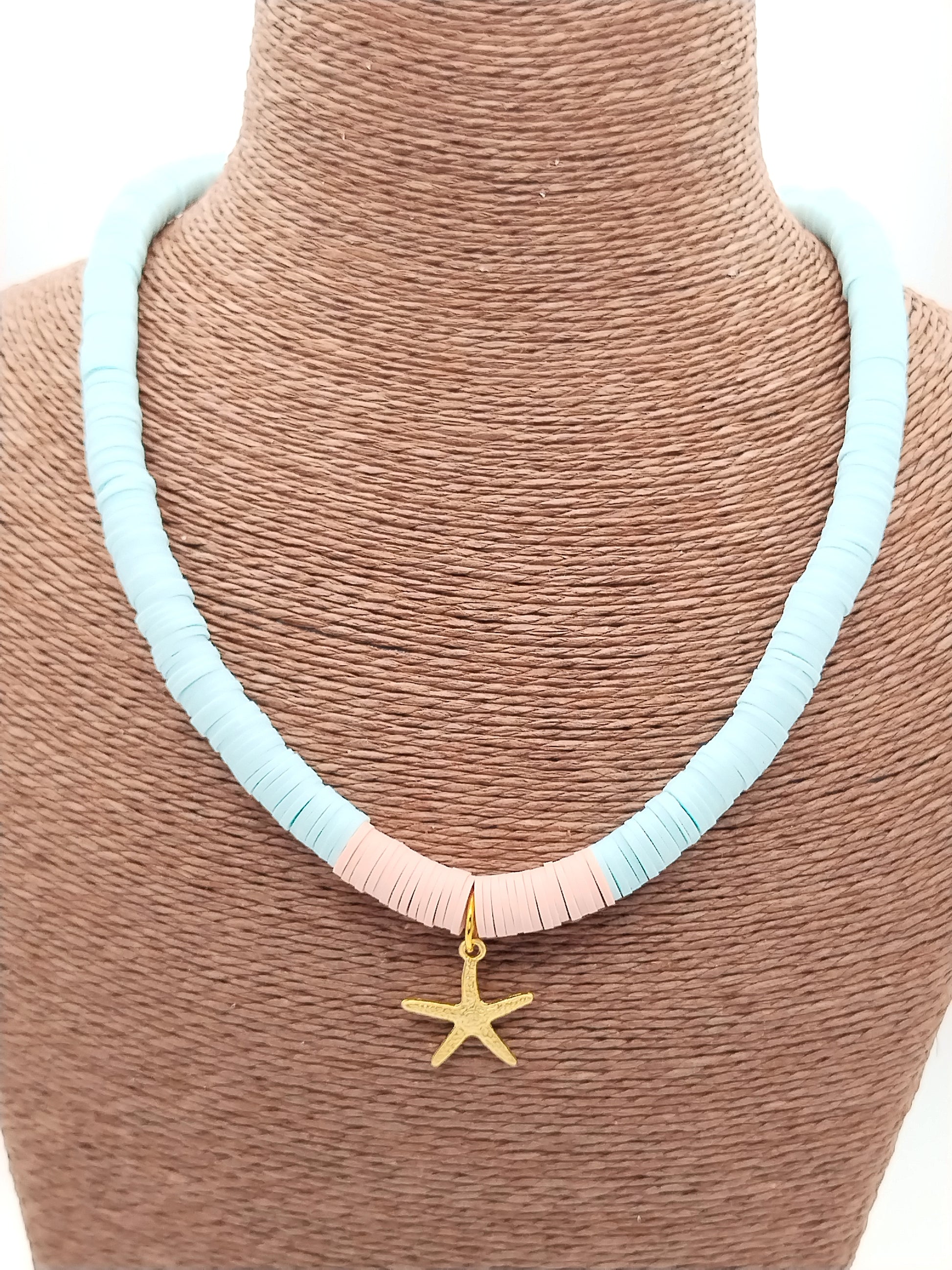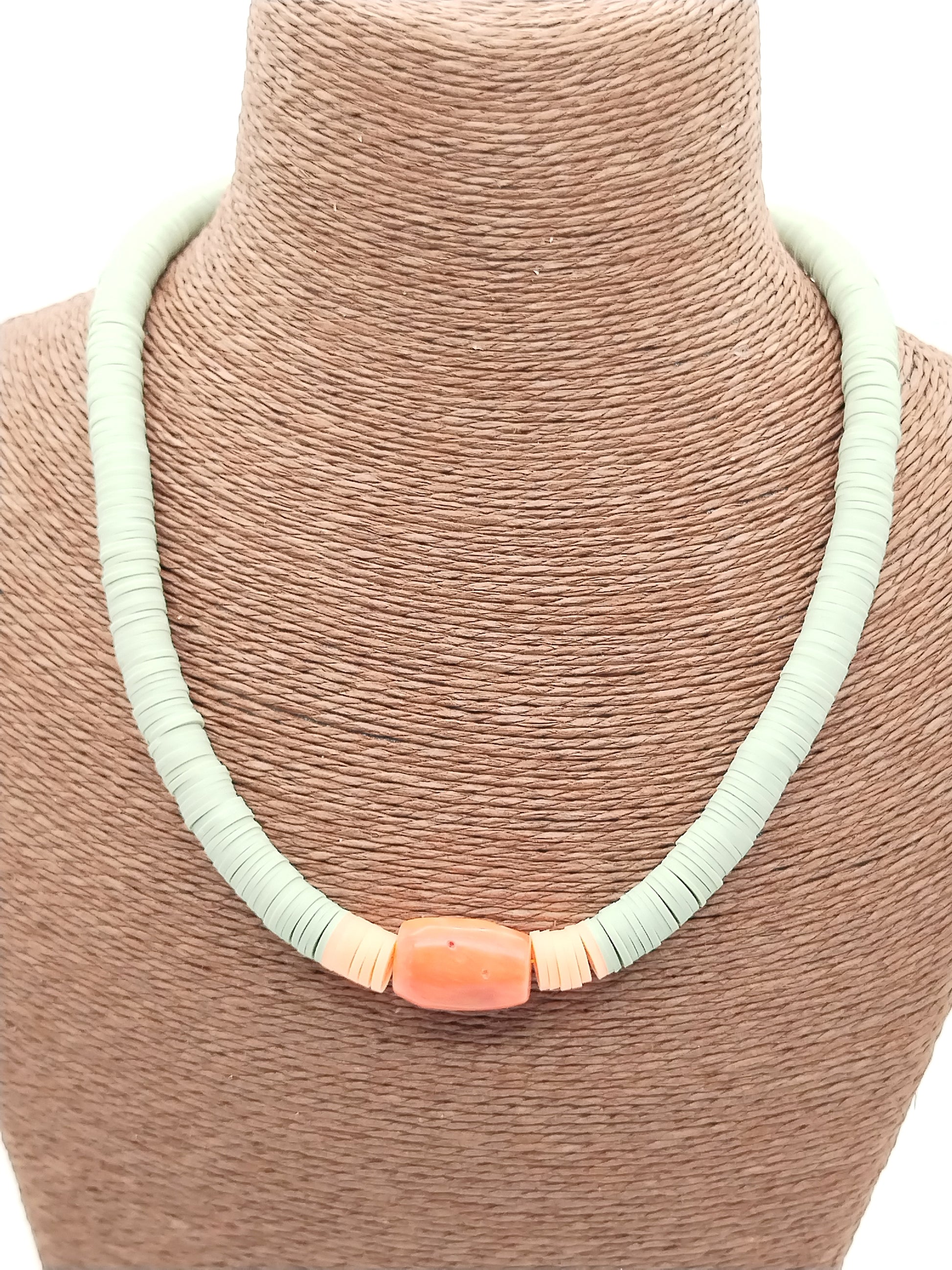 Vinyl Heishi Necklace with Matte Gold Charm. Colorful Necklace